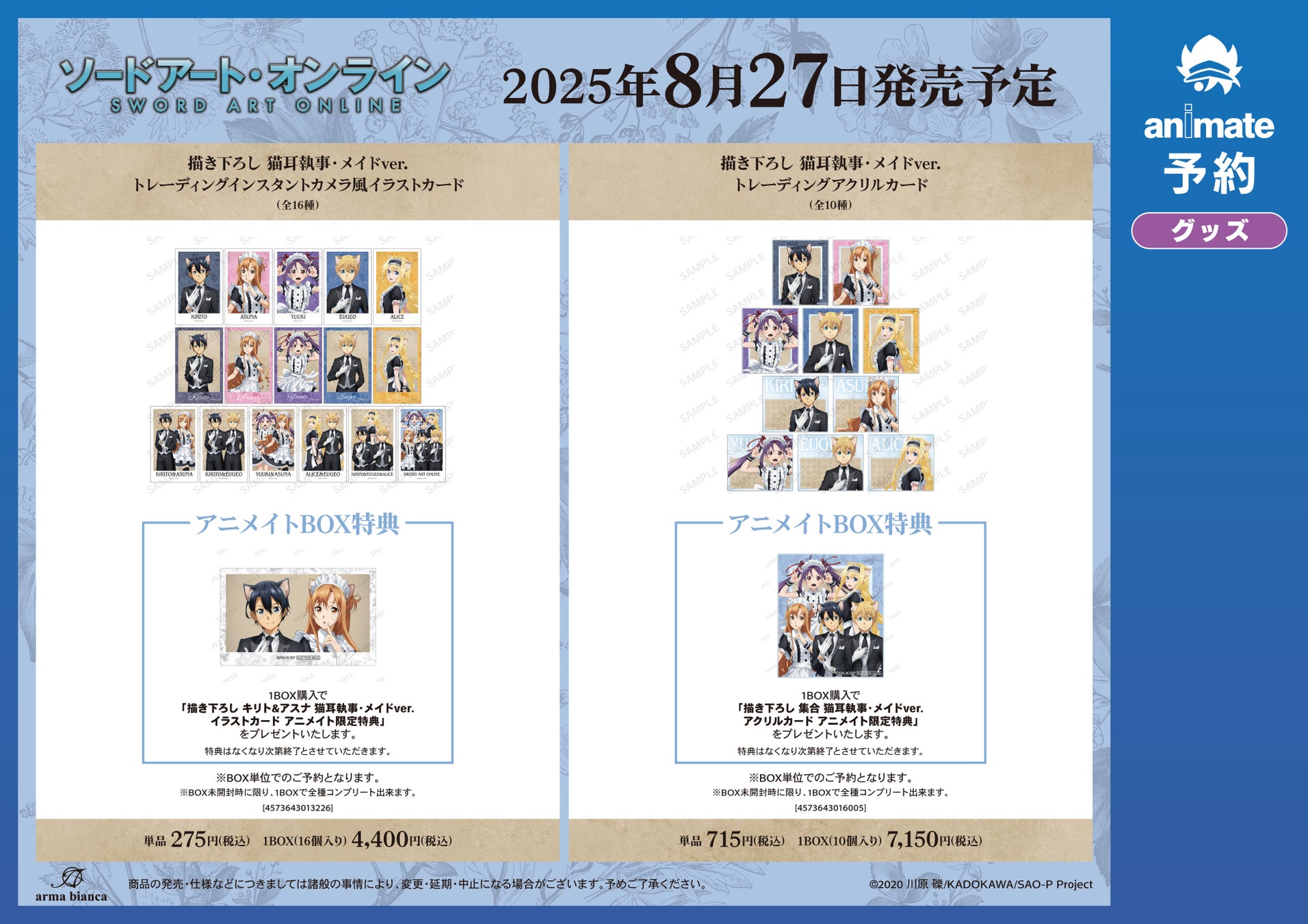 ※6月30日(月)より予約開始予定のECサイト「AMNIBUS」では、BOX購入特典として「描き下ろし キリト&ユージオ 猫耳執事・メイドver. アクリルカード AMNIBUS限定特典」を予定しております。