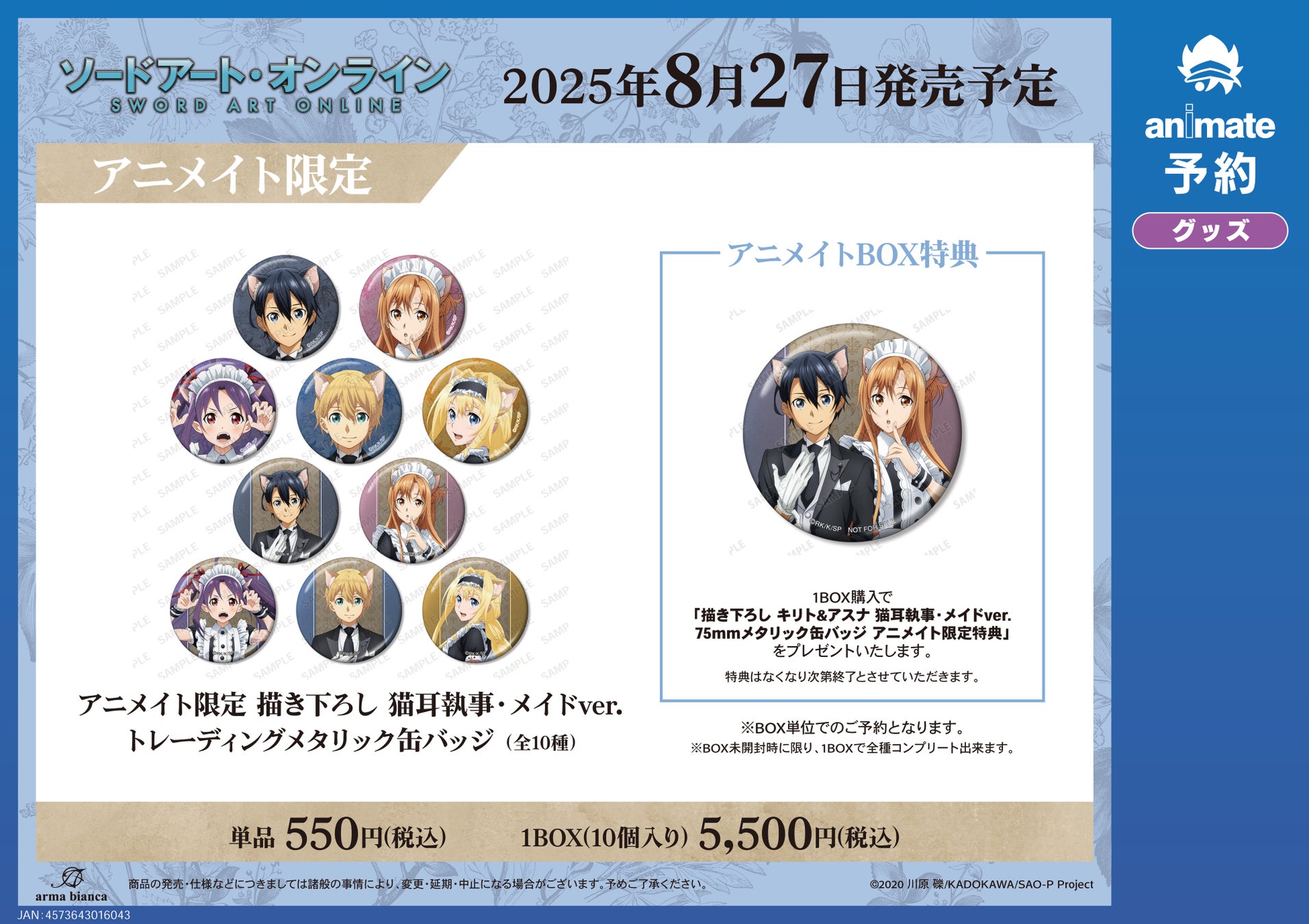 1BOX購入で「描き下ろし キリト&アスナ 猫耳執事・メイドver. 75mmメタリック缶バッジ アニメイト限定特典」をプレゼントいたします。