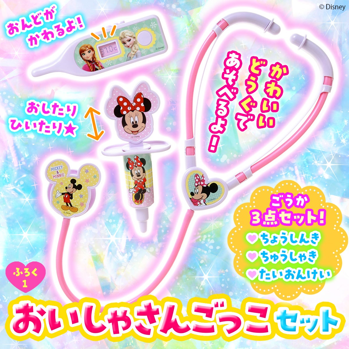 エルサとアナ、ミニー&ミッキーがデザインされた、かわいい「おいしゃさんごっこセット」。体温計・注射器・聴診器の3つがそろったセットです。体温計は、ボタンを動かすと表示される温度が変わります。注射器は、押し子を押したり引いたりできる仕かけになっています。体に当てる部分がキュートなミッキーの形の聴診器とあわせて、楽しい遊びが広がります!
