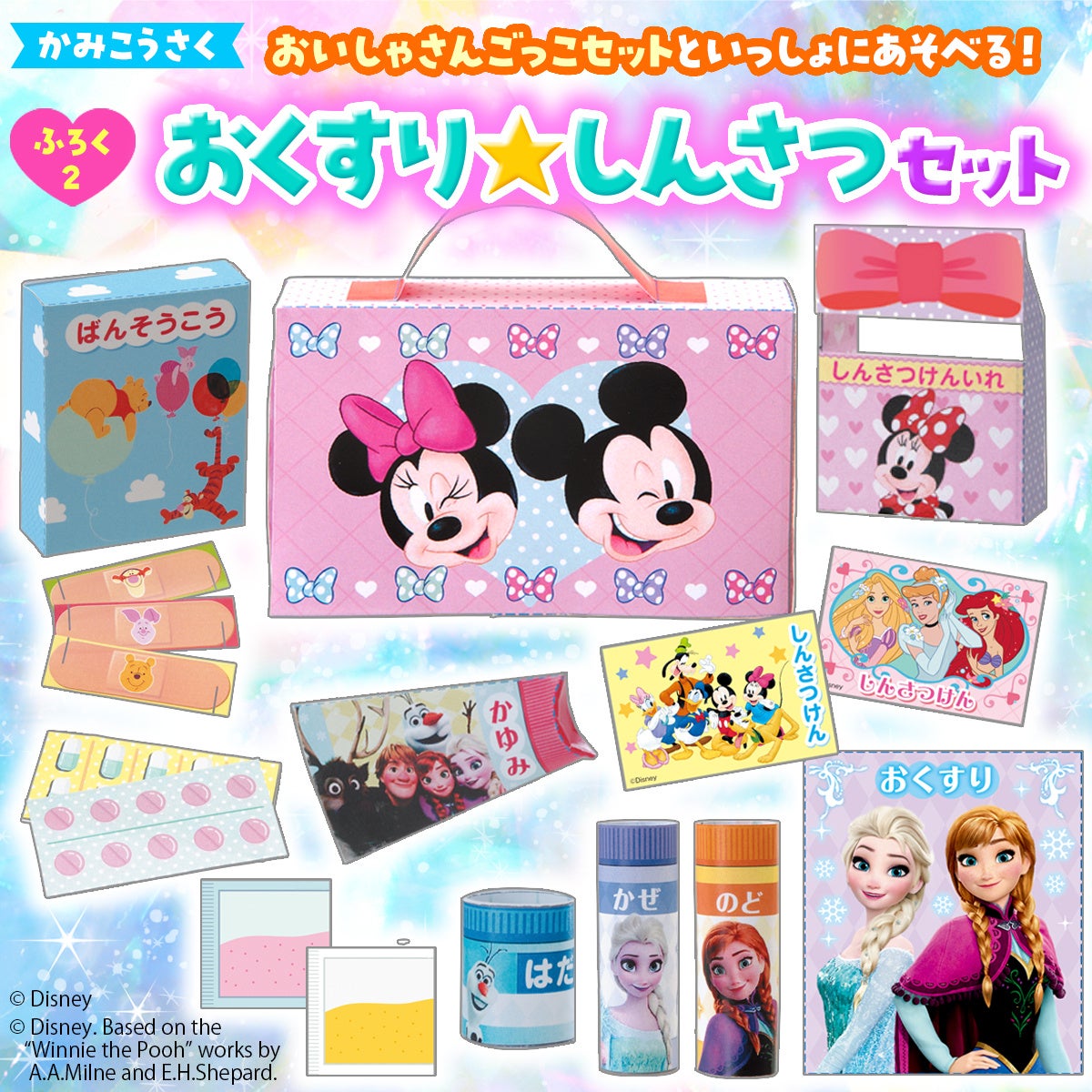 付録1「おいしゃさんごっこセット」での遊びがもっと楽しくなる、おくすりや診察アイテムが作れる紙工作。クリニックで使っているような診察券や診察券入れのほか、いろいろな形の「おくすり」がそろった全17種類! ばんそうこうは、指に巻いて遊べます。遊んだあとは、ミッキー&ミニーのおいしゃさんバッグにお片づけ。