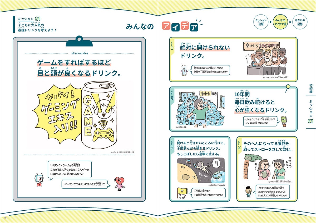 クリエイティブな発想力を鍛えるための、20のユニークなミッションを掲載!「夏休みを1日だけ長くする方法を考えよう!」「運動会の新種目を考えよう!」など、身近なトピックながらも、ちょっぴりヘンテコなミッションに取り組むことで、通常のドリルでは鍛えることができないような発想力を磨けます。自由に想像を膨らませて、自分だけのアイデアを生み出してみましょう!