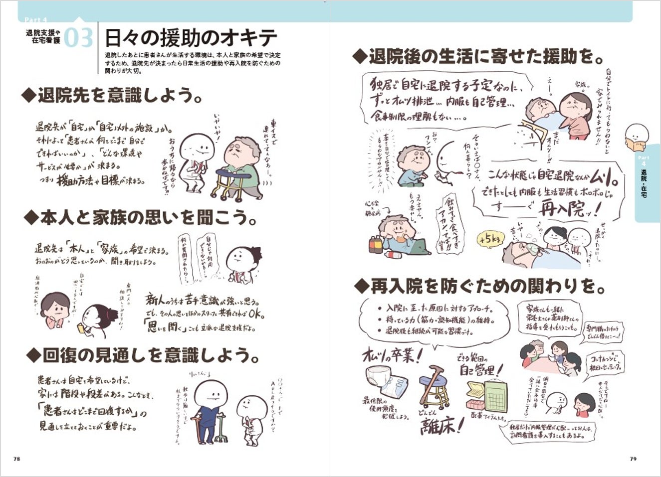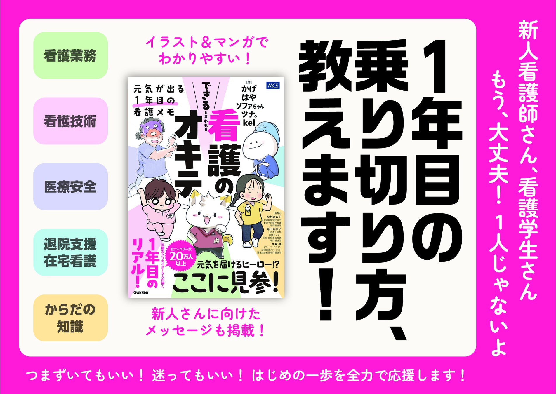本書は、さまざまな場面でつまずきやすい医療現場にいる新人看護師や実習に行く看護学生に「1人じゃないよ」と、その場面の乗り切り方を全ページ、イラストとマンガでわかりやすく伝える内容となっています。