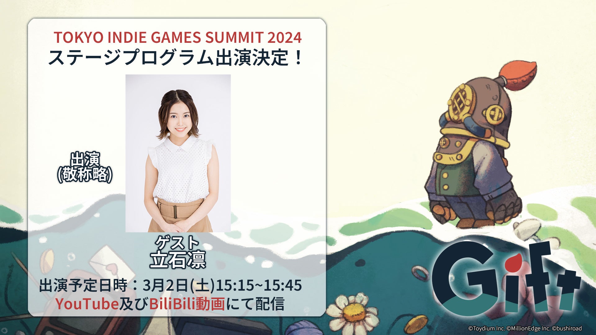 2024年3月2日(土)・3日(日)に東京・吉祥寺で開催されるインディーゲームの祭典TOKYO INDIE GAMES SUMMIT 2024のステージに『Gift』が出演。声優の立石凛さんによる試遊プレイを実施致します。
