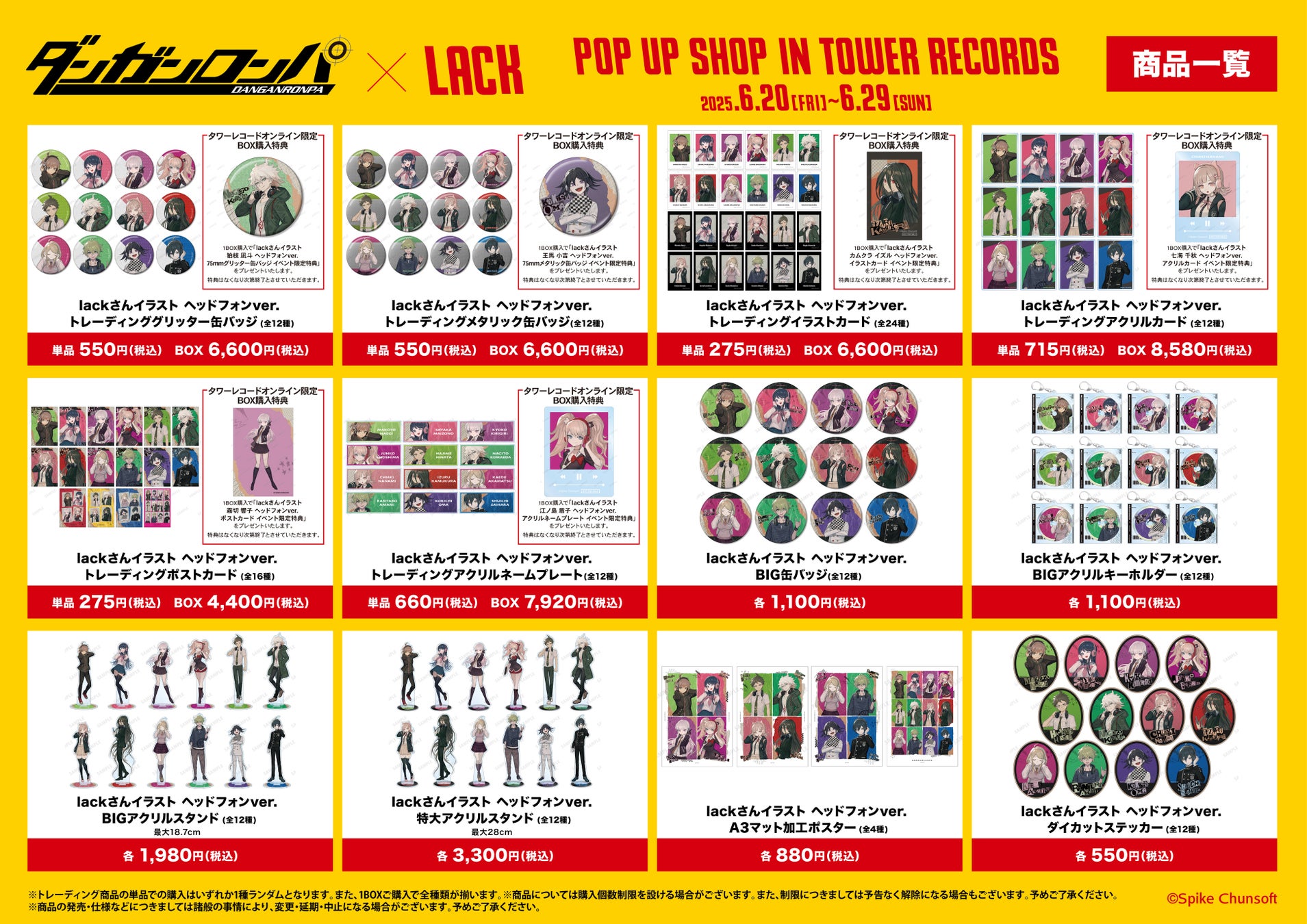 2025年6月20日(金)~6月29日(日)までタワーレコード 新宿店、梅田NU茶屋町店、名古屋パルコ店、計3店舗とタワーレコード オンラインにて「『ダンガンロンパシリーズ×lack』 POP UP SHOP in TOWER RECORDS」の開催が決定いたしました。