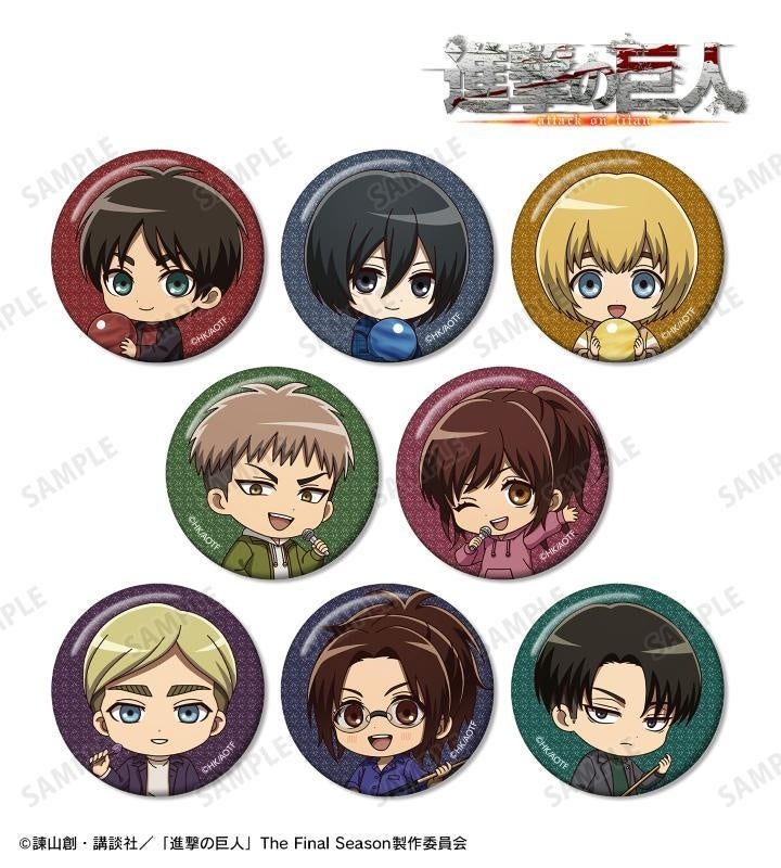 エレン、ミカサ、アルミン、ジャン、サシャ、エルヴィン、ハンジ、リヴァイのちびキャライラストをグリッター加工を施した缶バッジに仕上げました。