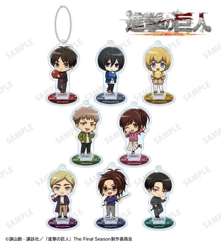 エレン、ミカサ、アルミン、ジャン、サシャ、エルヴィン、ハンジ、リヴァイの描き起こしイラストをアクリルスタンドキーホルダーに仕上げました。
