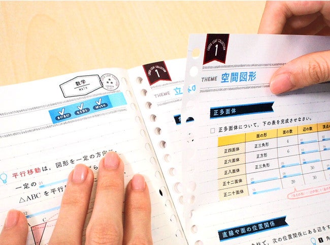 全ページにバインダーにとじるための穴があいており、1枚ずつはぎ取れる特殊な製本になっているため、そのままルーズリーフのように使用できます。中学シリーズは、便利な「マスキングシール」と「時間割」つき。