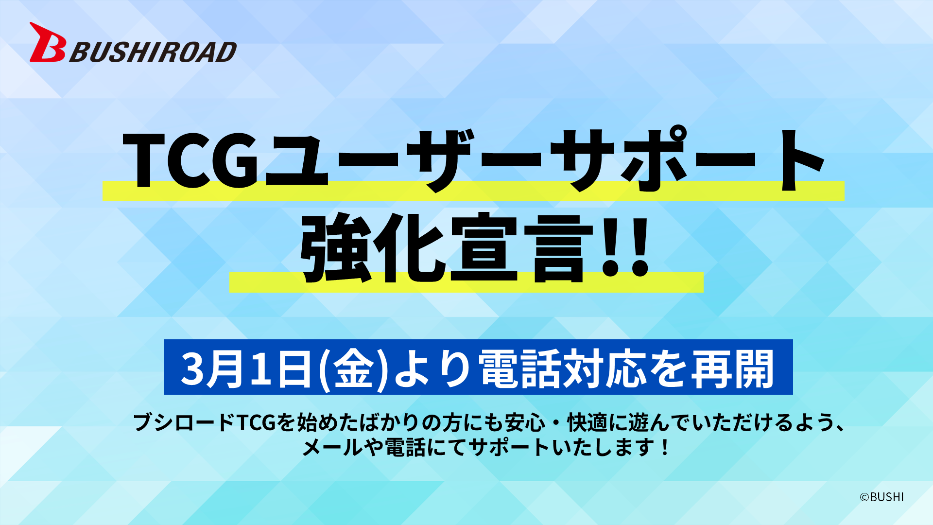 株式会社ブシロード(本社:東京都中野区 代表取締役社長:木谷高明、以下、ブシロード)は、お客様がより安心・快適に遊んでいただけるよう、2024年3月1日(金)よりブシロードTCGの電話でのお問い合わせ対応を再開し、ユーザーサポートを強化することをご報告いたします。報道関係の皆様におかれましては、ぜひ本情報をお取り扱いいただきますようお願い申し上げます。