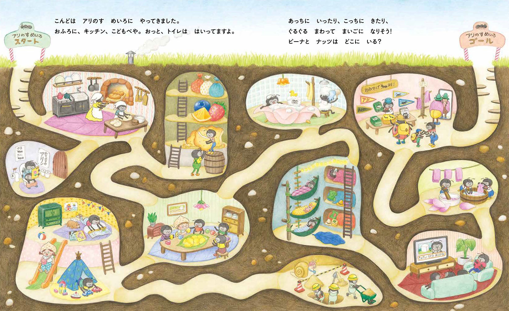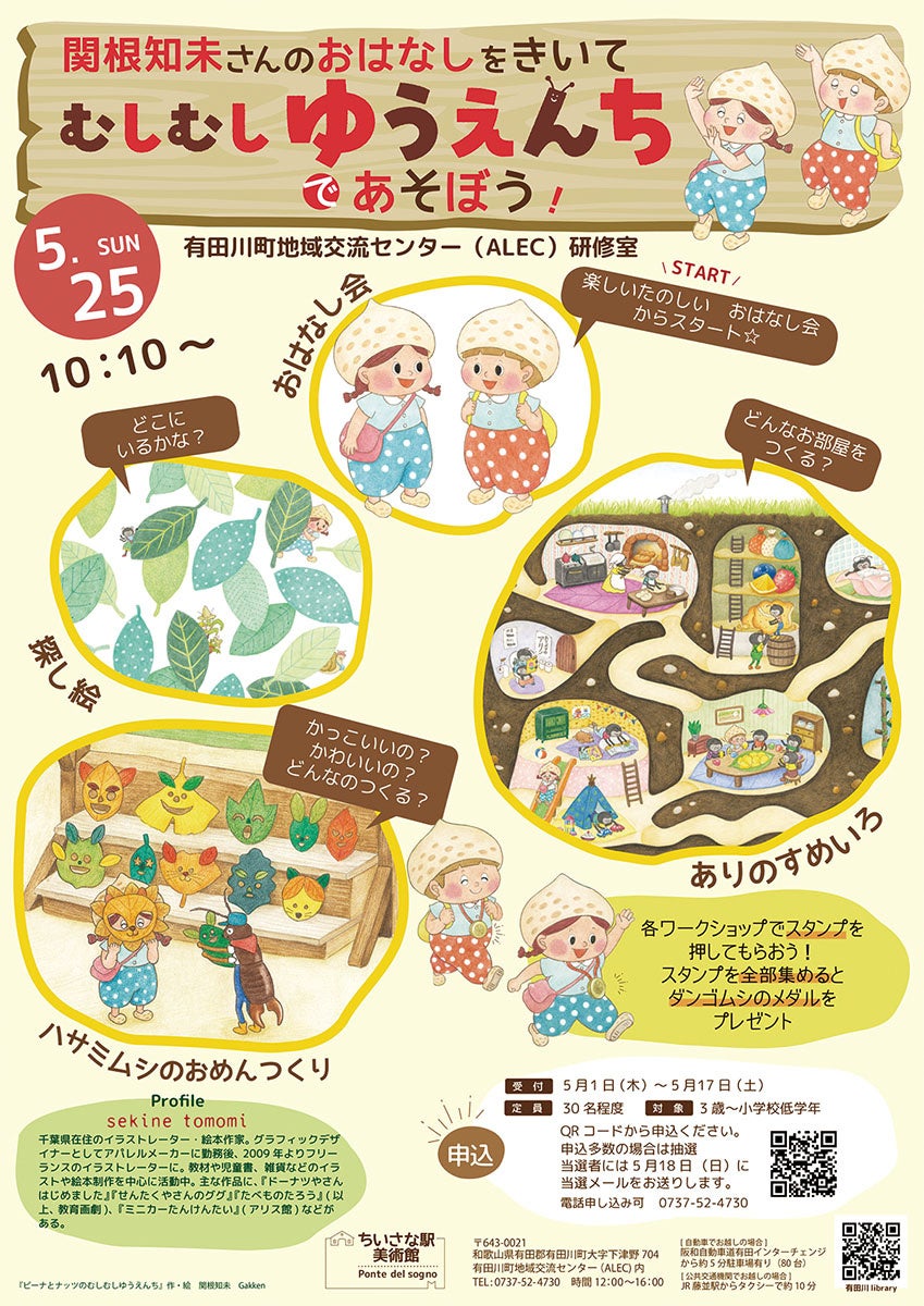 5月25日(日)には関根知未さんをお招きし、楽しいおはなし会&ワークショップ、サイン会もあります。ワークショップは、絵本の内容にちなんで、ピーナとナッツの絵探しや、ありの巣めいろのお絵描き、葉っぱのお面作りなど盛りだくさん。定員30名様程度で予約が必要です。虫たちのかわいい遊園地が楽しめる絵本原画展へ、ぜひお越しください。