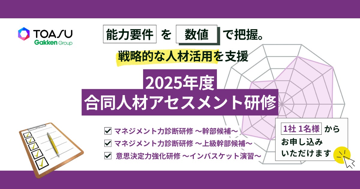 株式会社 学研ホールディングス(東京・品川/代表取締役社長:宮原博昭)のグループ会社、株式会社TOASU(東京・品川/代表取締役社長:宮田 晃)は、2025年度合同人材アセスメント研修「マネジメント力診断研修~ 上級幹部候補~」「マネジメント力診断研修~ 幹部候補~」「意思決定力強化研修~ インバスケット演習~」の3コースを提供開始いたします。