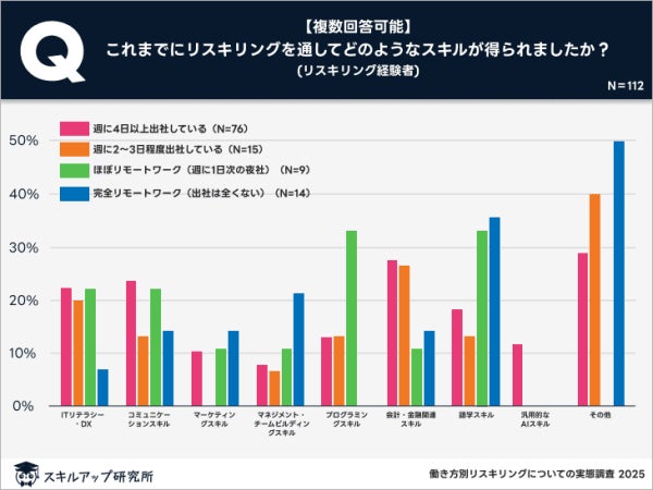 リスキリングを通して得られたスキルの種類を見ると、出社中心の人では会計・金融スキルを習得した割合がリモート中心の人よりも高く、一方、リモート中心の人では語学スキルを習得した割合が高いという興味深い結果が得られた。