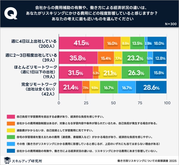 会社からの費用補助の有無や働き方による経済状況の違いがリスキリングにかける費用に与える影響について尋ねたところ、どの層においても、「自己負担で学習費用を捻出する必要があり、経済的な負担を感じやすい」という意見が多数を占めた。