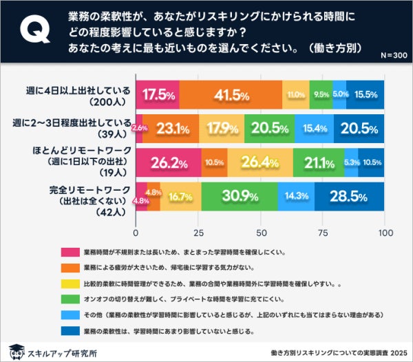 業務の柔軟性と学習時間の関係性については、出社頻度が高いほど業務による疲労が、出社頻度が低いほどオンオフの切り替えの難しさが学習時間を確保する上での課題として挙げられた。