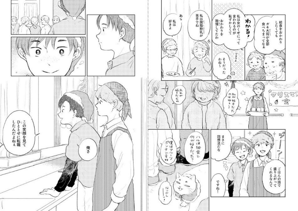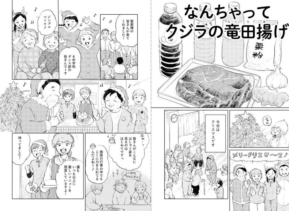 6巻は、クリスマスのお話。グループホームひととせでは、近所の人や家族を招いてクリスマスパーティーを開催しました。歌にダンスに楽しんだあとはみんなでごはん。今回のメインは、給食メニューに登場していた「なんちゃってクジラの竜田揚げ」。牛肉を使って懐かしい味を再現しています。また、入居者の皆さんが昔話に花を咲かせている賑やかなひとときを描いています。