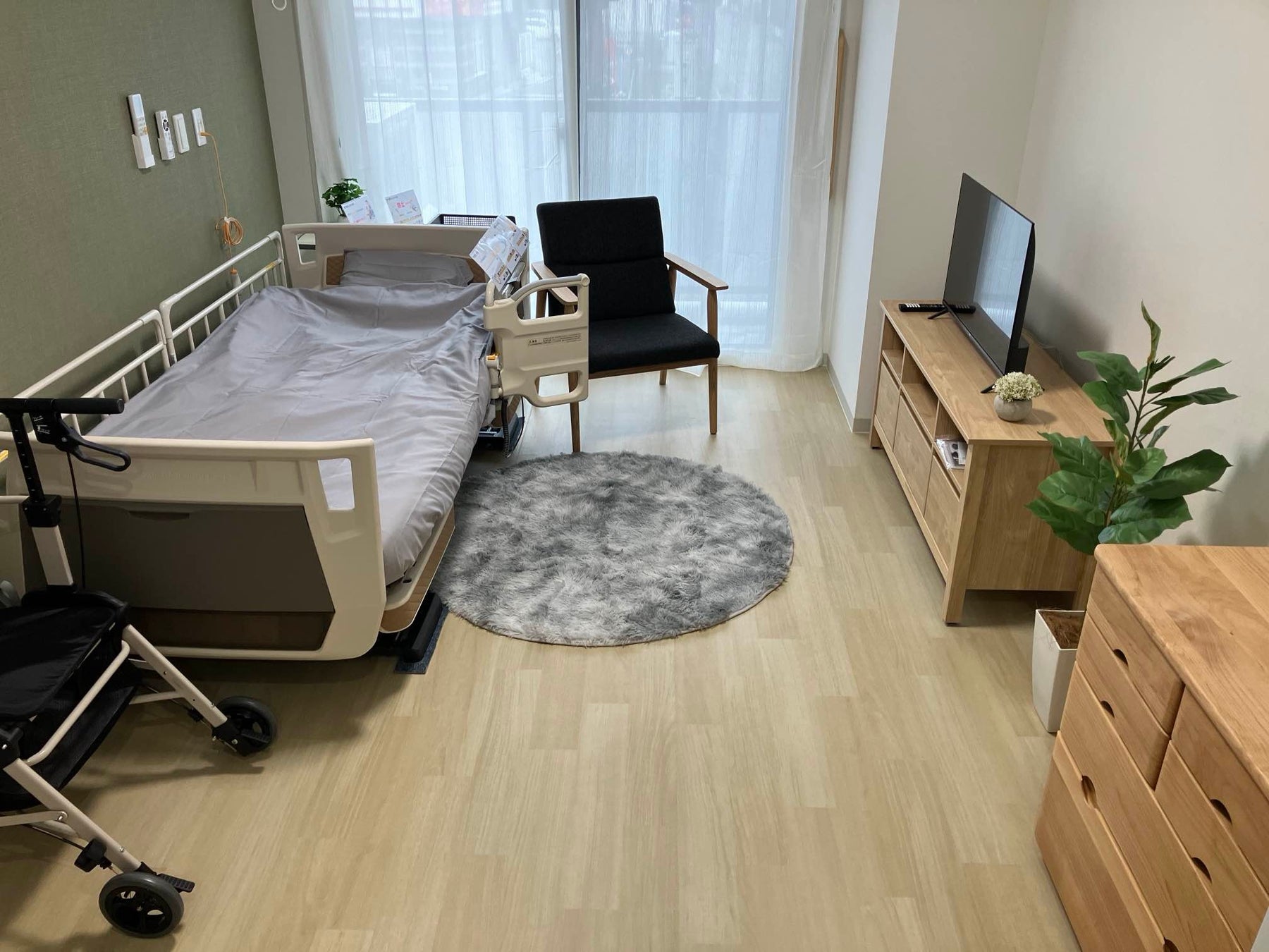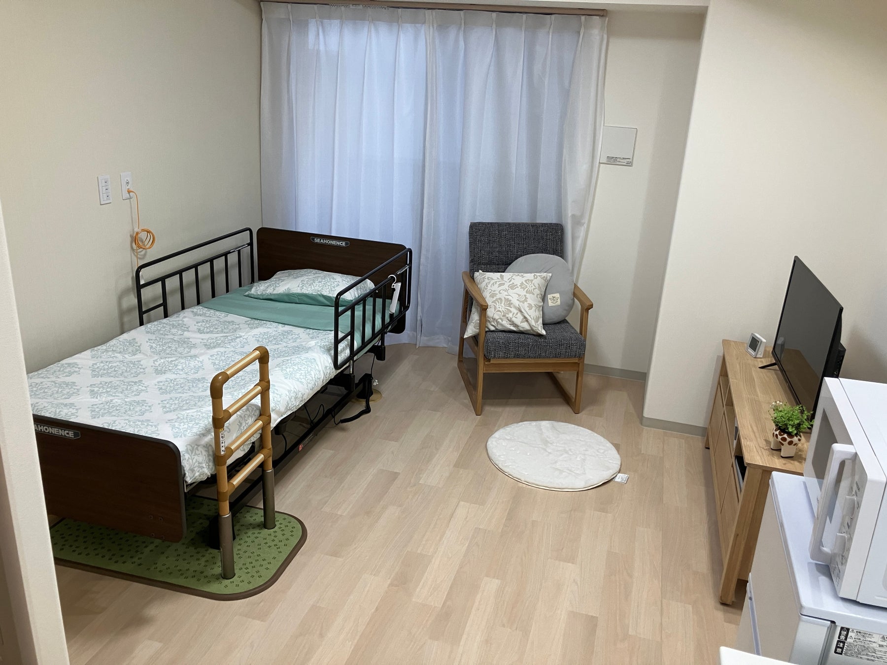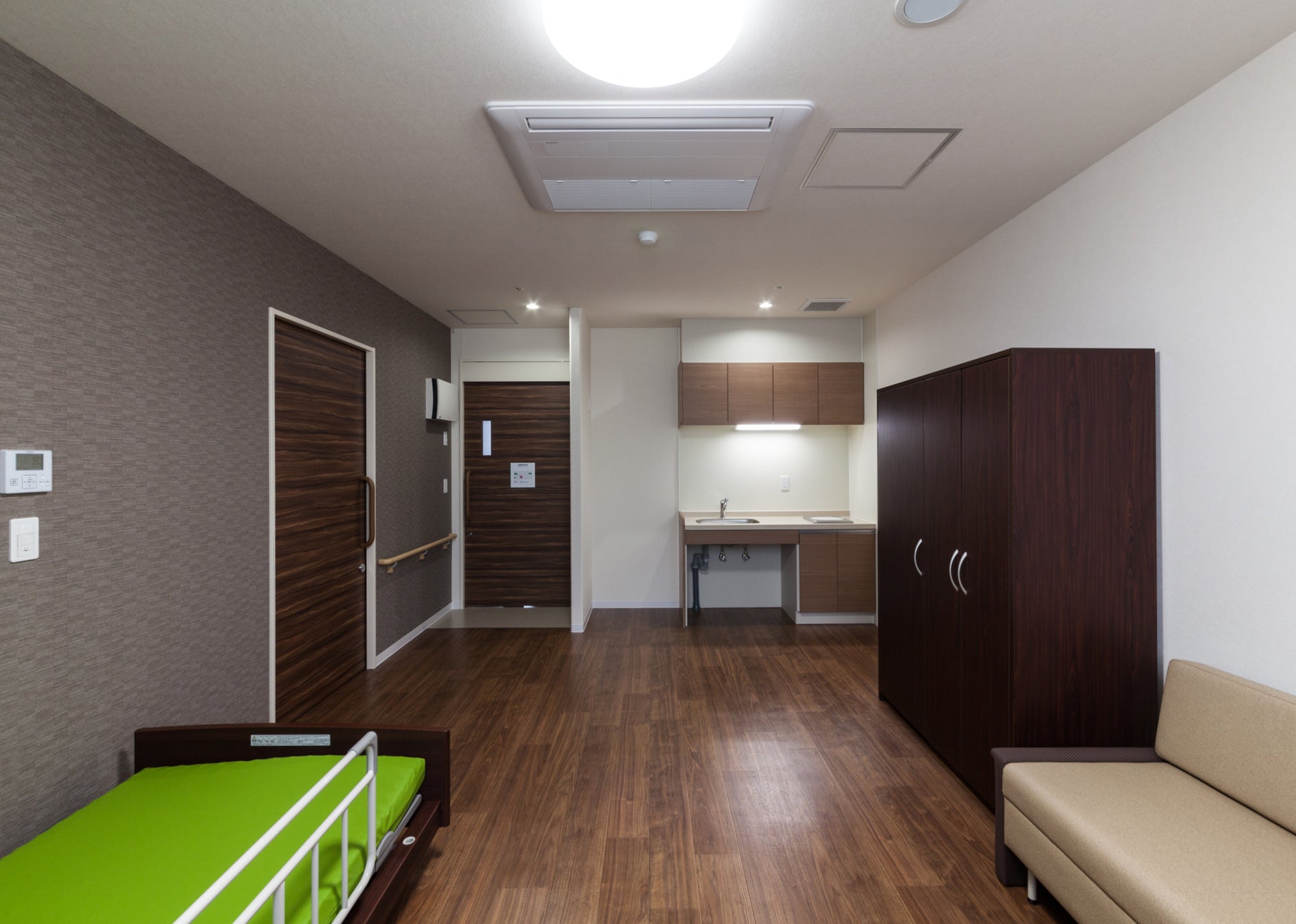 居室設備:トイレ、洗面台、クローゼット、エアコン、照明、スプリンクラー、電動ベッド、緊急通報装置、浴室(一部)、ミニキッチン(一部)、リズムセンサー(一部)