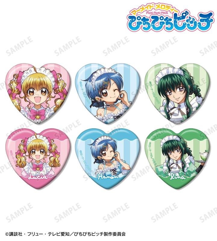 七海 るちあ、宝生 波音、洞院 リナの描き下ろしイラストを、ガーリーなデザインのハート型缶バッジに仕上げました。