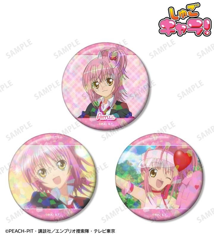 日奈森 あむ、アミュレットハート、月詠 イクト、ブラックリンクス、辺里 唯世、プラチナロワイヤル、藤咲 なでしこ、ヤマトマイヒメ、相馬 空海、スカイジャック、結木 やや、ディアベイビー、真城 りま、クラウンドロップ、三条 海里、サムライソウル、藤咲 なぎひこ、ビートジャンパー、ほしな 歌唄、ルナティックチャームのイラストをホログラム加工を施した缶バッジ3個セットに仕上げました。