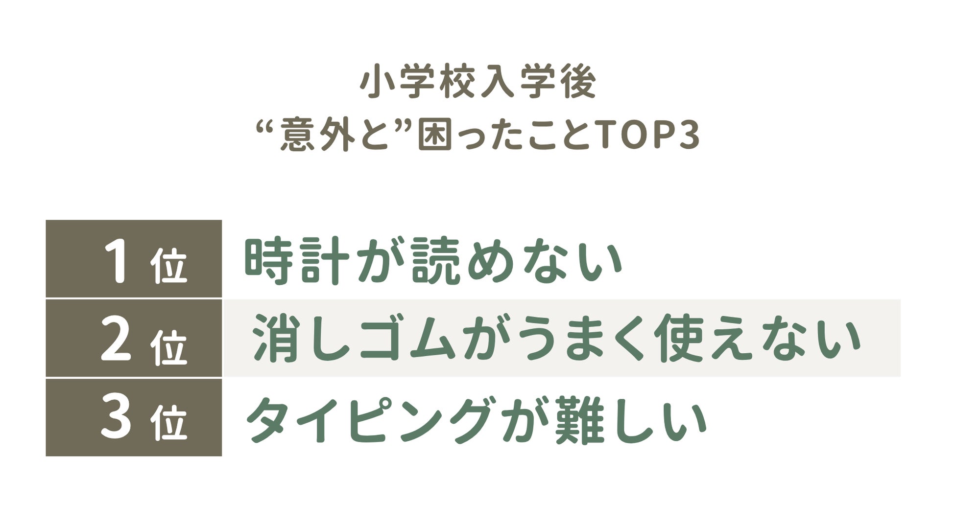 小学生のお子さんがいる保護者120名に「入学後に、学習面で意外と困ったこと」についてアンケートを実施したところ、第1位の「時計が読めない」に次いで、第2位にランクインしたのが「消しゴムがうまく使えない」でした。