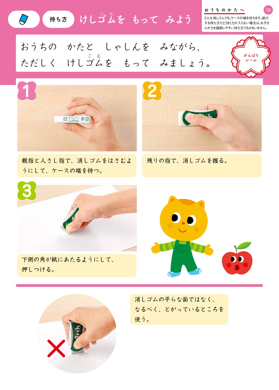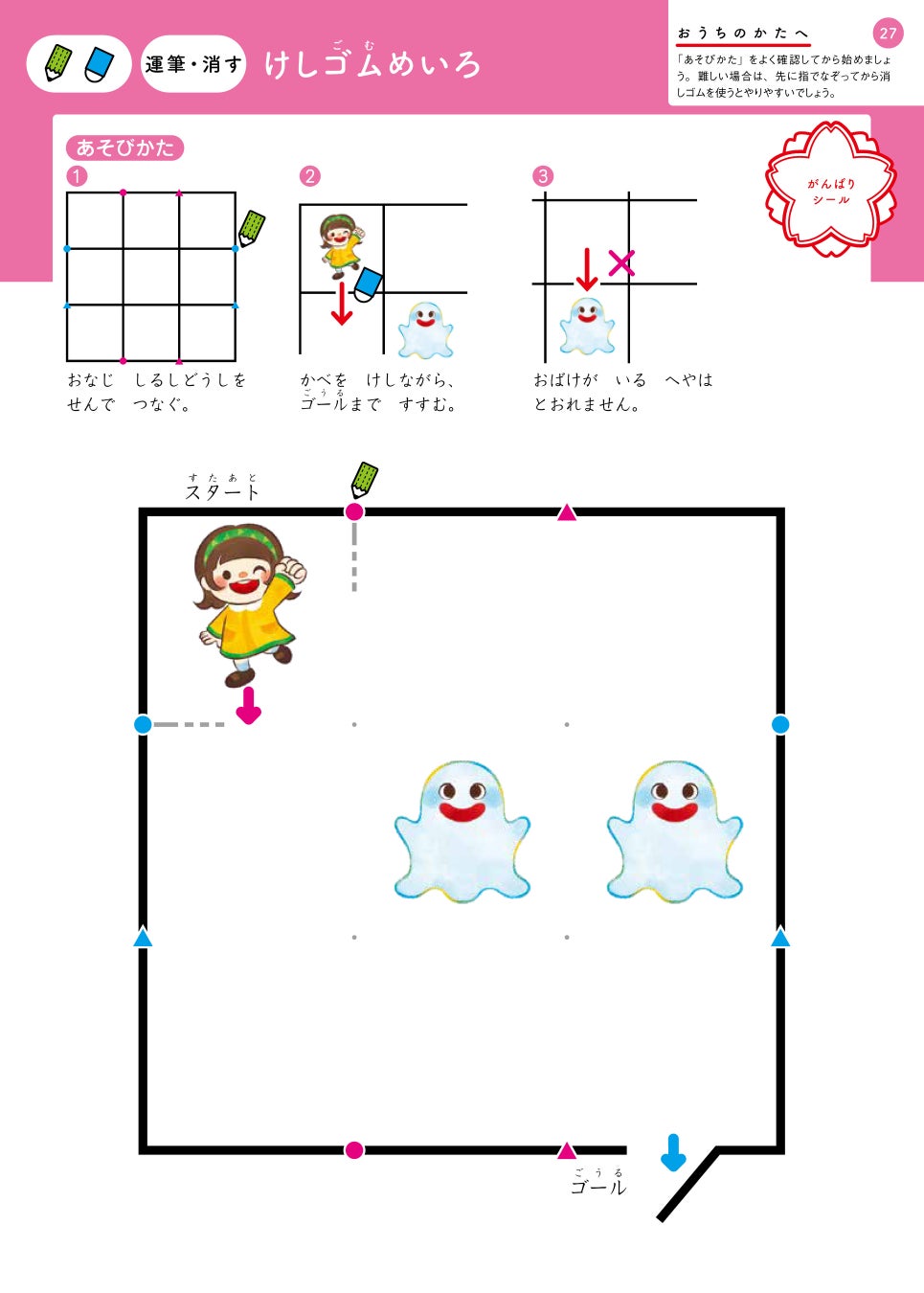 迷路、塗り絵、パズルなど、楽しい問題を通して鉛筆と消しゴムが上手に使えるようになる! 正しい持ち方・消し方の解説つきで、お子さんの「鉛筆・消しゴムデビュー」から、小学校入学後までを全面サポート!