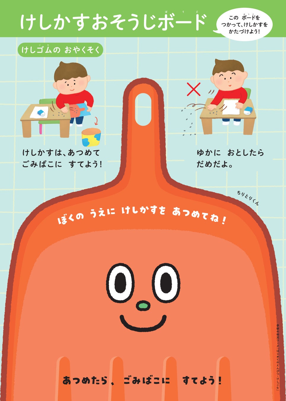 消しゴムを使うときのお約束も確認できる、消しかすお掃除ボードつき。