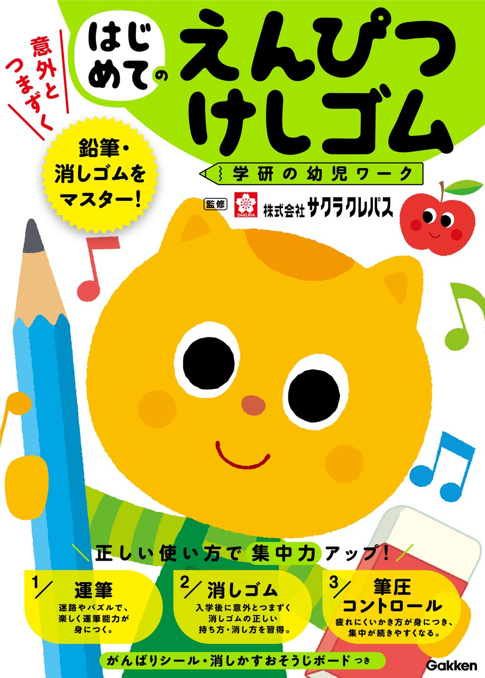 そこで、総合文具メーカーの株式会社サクラクレパス監修のもと、鉛筆練習をしながら消しゴムもマスターできる、これまでにないワークをつくりました!