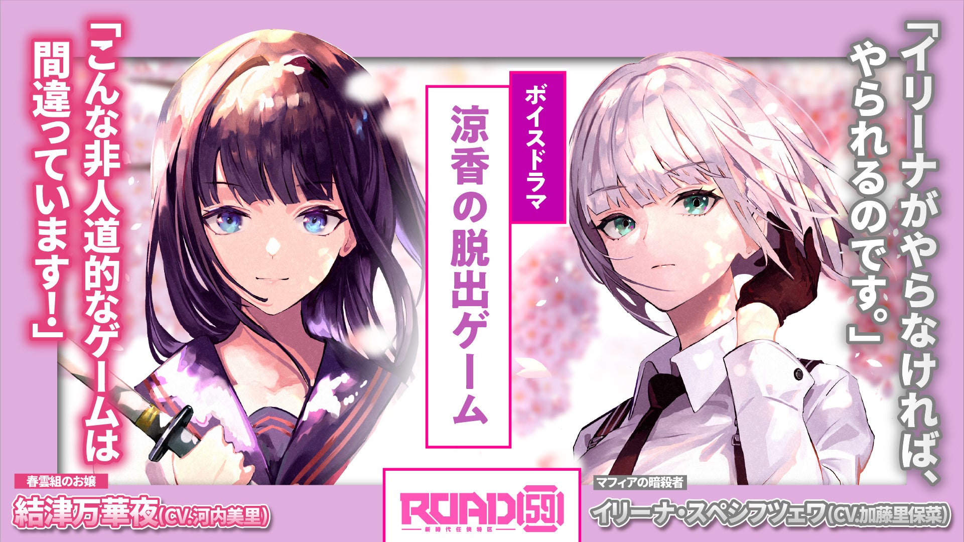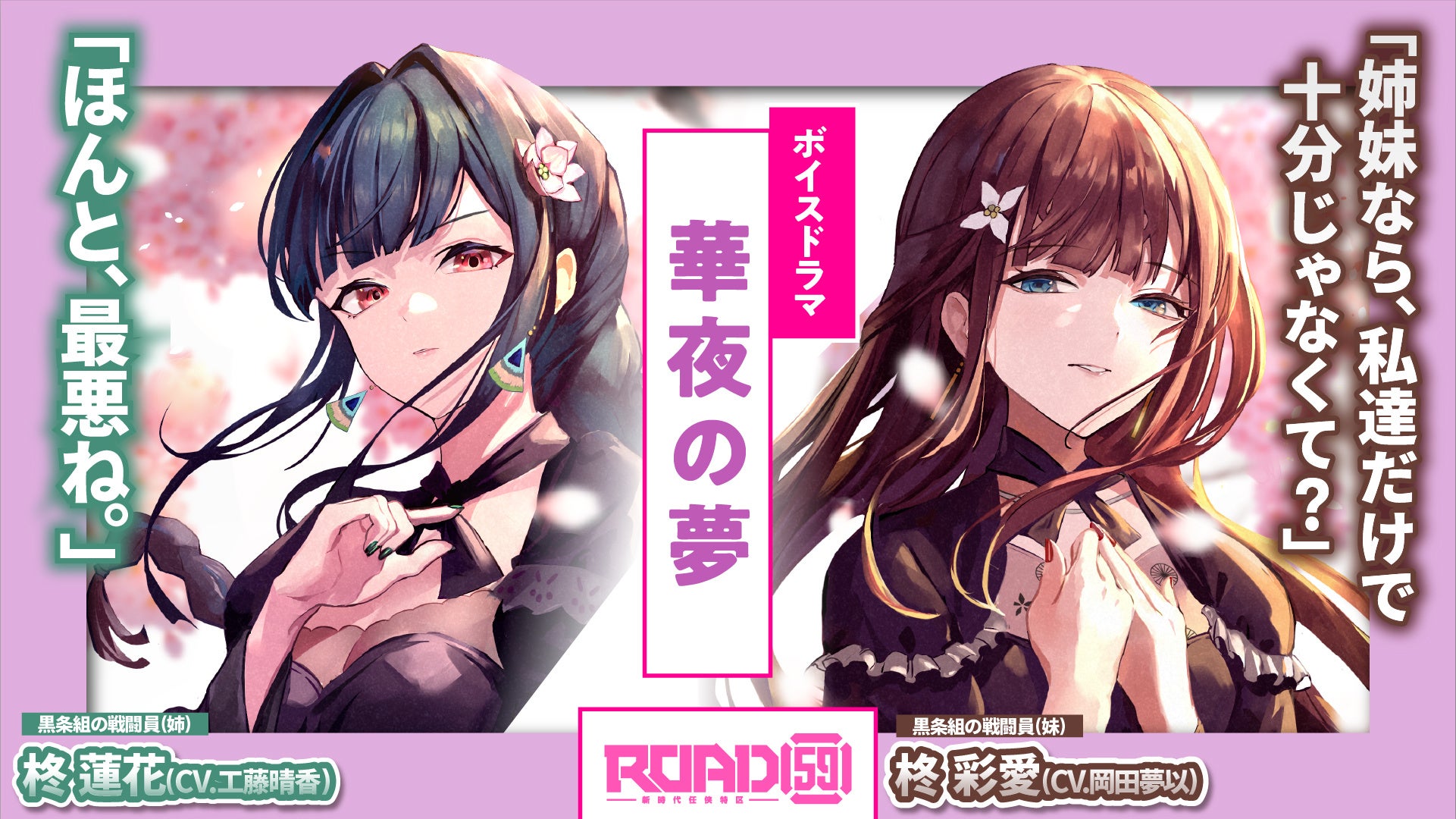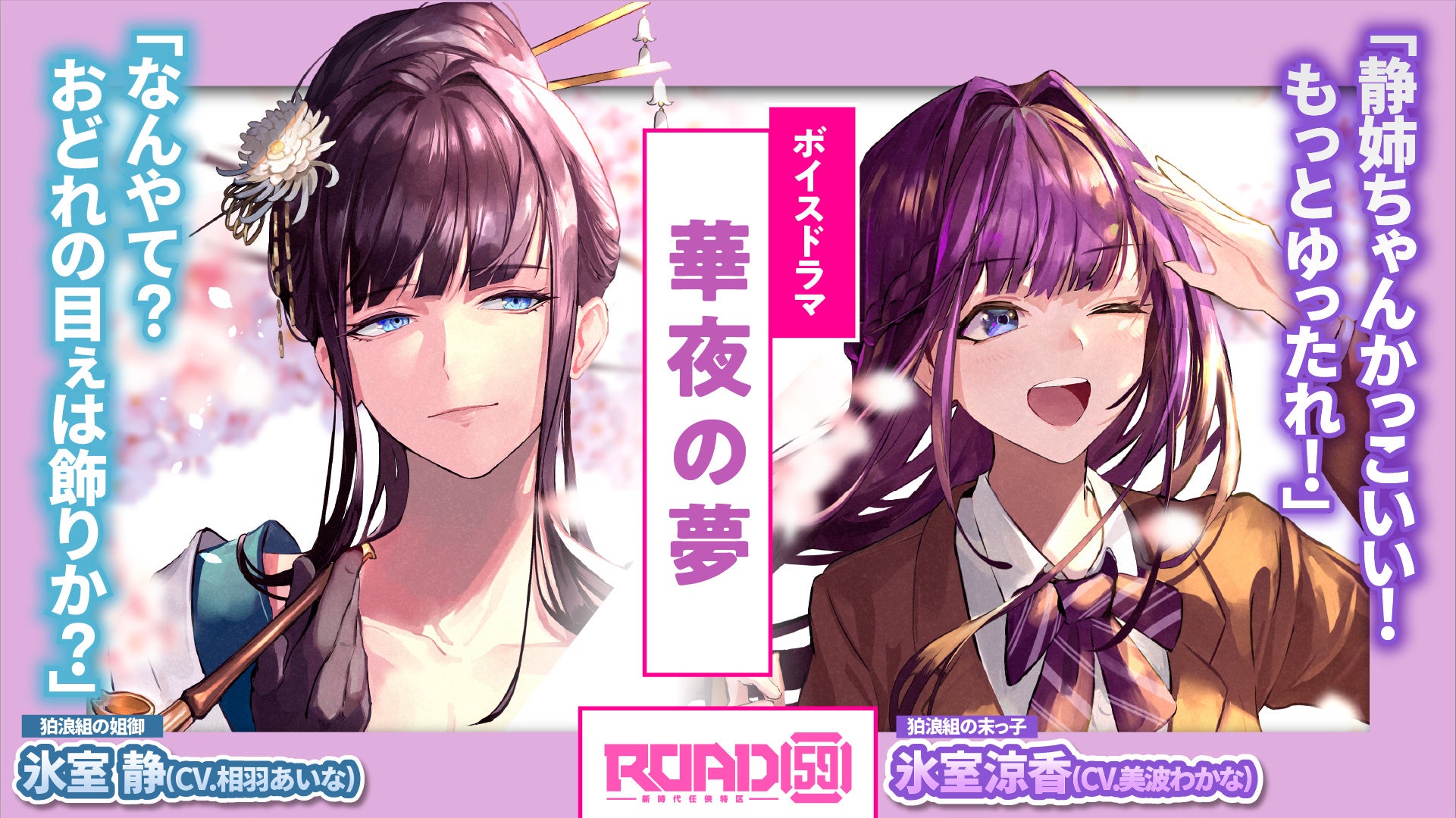 今回のボイスドラマでは、お嬢と姐御の女性キャラクター達が活躍する2つのストーリーをお届けしており、「華夜の夢」ではいつものROAD59本編とは違った「可愛い」がキーワードとなるちょっぴり不思議なストーリー。一方、「涼香の脱出ゲーム」では、抗争を繰り広げるROAD59ならではのひりつくようなキャラクター同士のかけあいが展開されています。