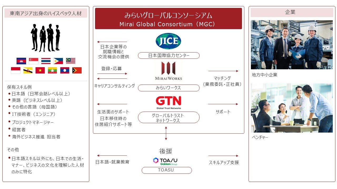このような状況において、TOASUは、みらいワークス、JICE、GTNと連携し、MGCを後援することで、日本での就業を希望する東南アジアのハイスペック人材に対して、日本語・就業教育を実施し、人手不足の課題を持つ地方中小企業とのマッチング(正社員または業務委託)や就業支援、就業後のサポートを提供します。