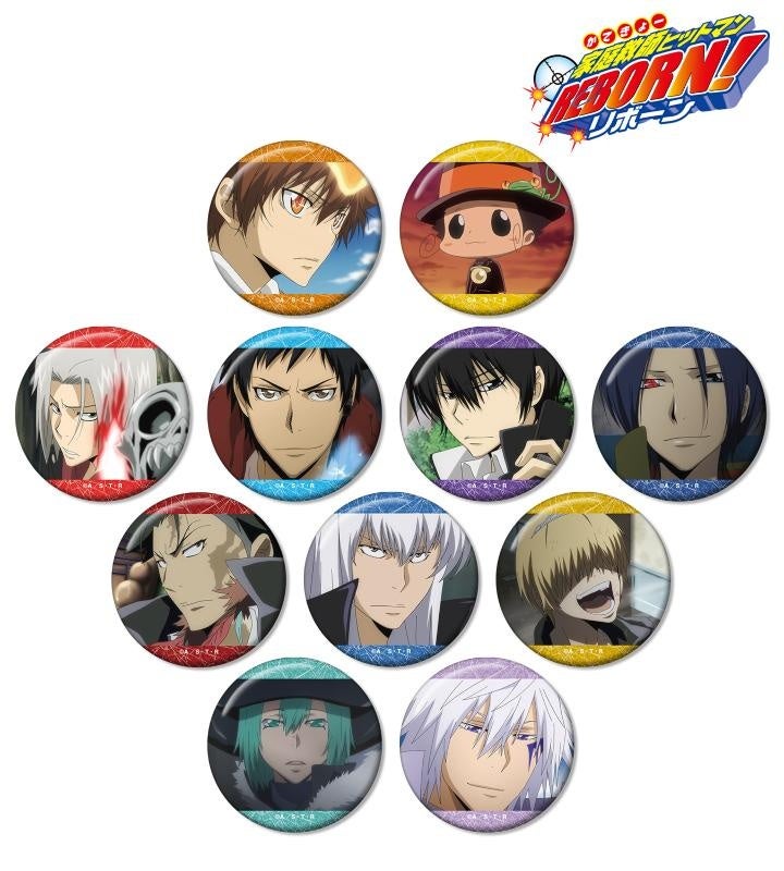 沢田 綱吉、リボーン、獄寺 隼人、山本 武、雲雀 恭弥、六道 骸、XANXUS、スペルビ・スクアーロ、ベルフェゴール、フラン、白蘭の印象的なシーンをグリッター加工を施した缶バッジに仕上げました。