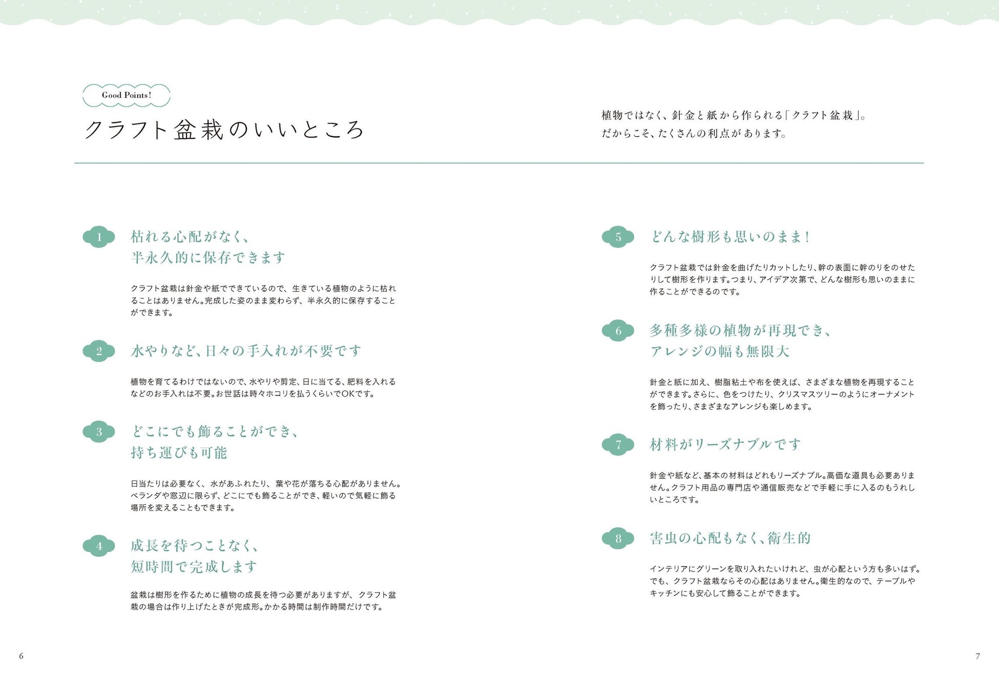 「今まで何か手芸を楽しんだことがある方なら、その簡単さと仕上がる作品のクオリティの高さにびっくりするかもしれません。クラフト盆栽づくりは、年をとってもずっとずっと楽しむことができるもの。もしかしたらあなたにとって一生楽しめる趣味との出会いになるかもしれません。」(本書「はじめに」より一部抜粋)
