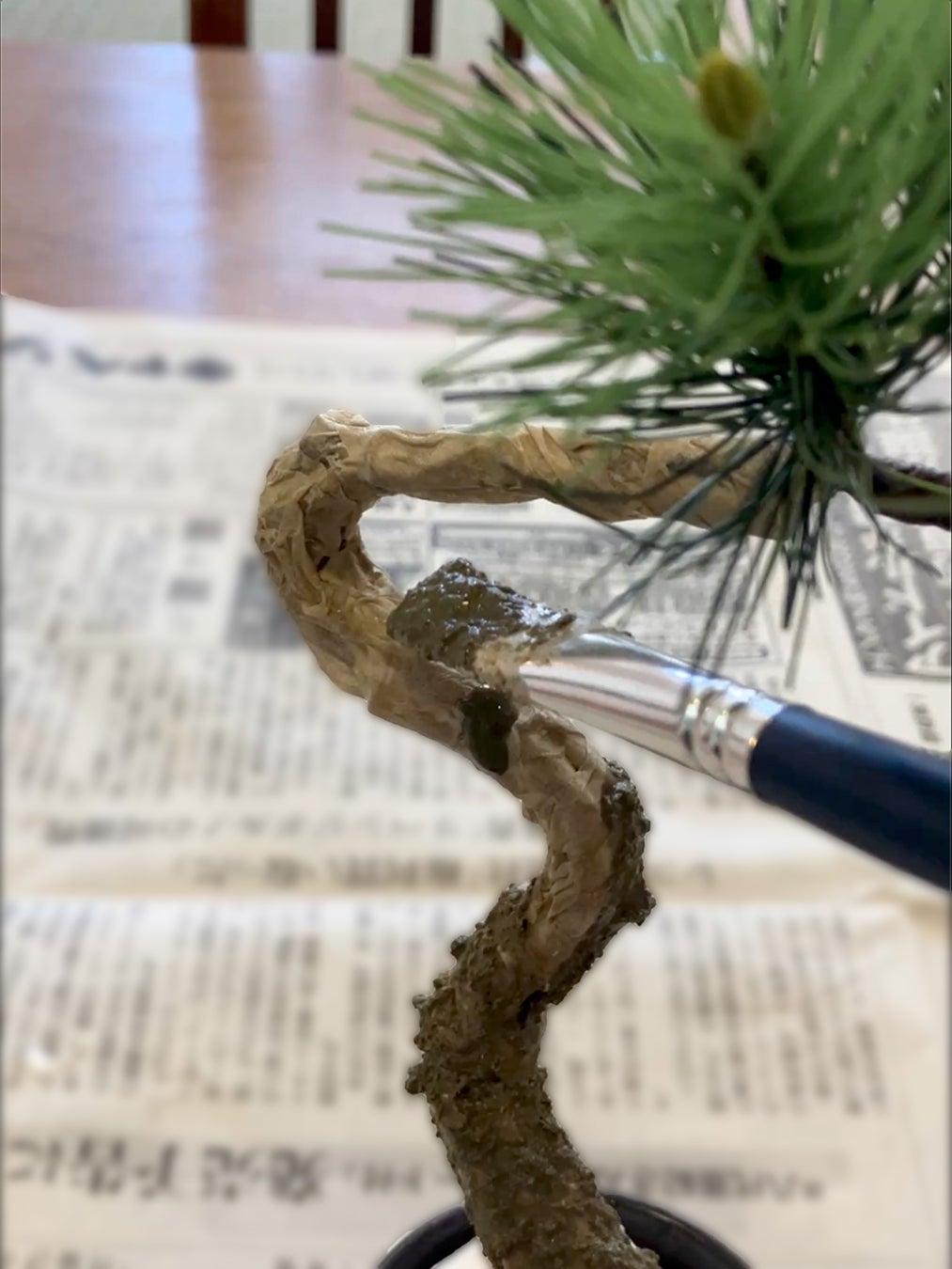 一番の盛り上がりは幹のりを幹の芯に塗り込んでいくところから! それまで「これが松になるの?」という不安が若干ありましたが、一気に「わぁ! 松っぽくなった」という感動を味わえます。日ゴケをふりかけて「わぁ!」、土を盛って「わぁ!」、山ゴケを乗せて「わぁ!」。