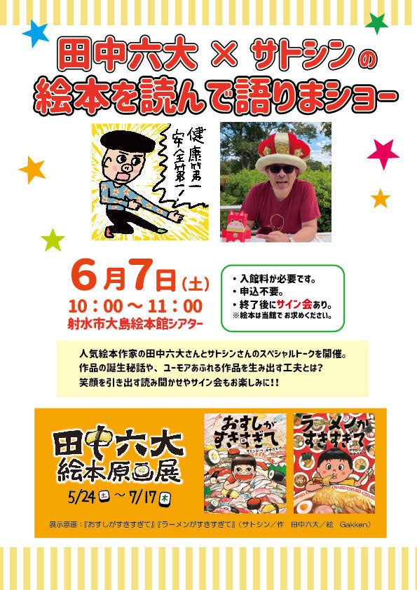 株式会社 学研ホールディングス(東京・品川/代表取締役社長:宮原博昭)のグループ会社、株式会社 Gakken(東京・品川/代表取締役社長:南條達也)は、2025年5月24日(土)から7月17日(木)まで、絵本『おすしがすきすぎて』『ラーメンがすきすぎて』で人気の絵本作家・田中六大さんの絵本原画展を、射水市大島絵本館(富山)にて開催いたします。6月7日(土)には絵本作家・サトシンさんとのイベント&サイン会もあります。ぜひお越しください。