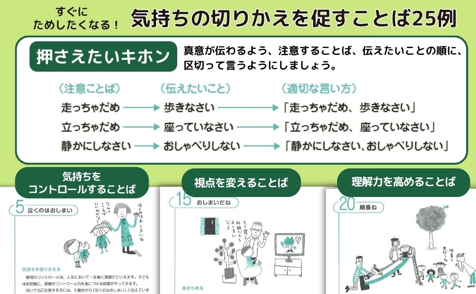 子どもに声をかけるときには、真意が伝わるよう、注意することば、伝えたいことの順に、区切って言うことが大切です。本書では、【気持ちをコントロールすることば】【視点を変えることば】【理解力を高めることば】に分け、親が子どもにかけたいことば、子どもが自分で言えるようにしたいことばを紹介します。