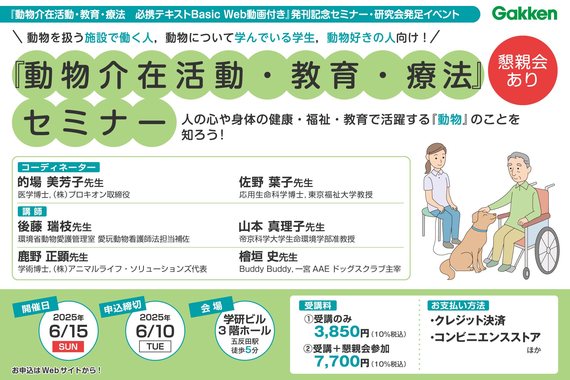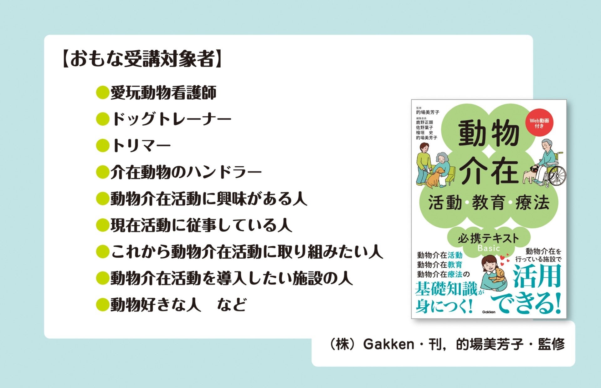 株式会社 学研ホールディングス(東京・品川/代表取締役社長:宮原博昭)のグループ会社、株式会社 Gakken(東京・品川/代表取締役社長:南條達也)は、2025年6月15日(日)に、『動物介在活動・教育・療法 必携テキストBasic Web動画付き』発刊記念セミナー・研究会発足イベントとして、人の心や身体の健康・福祉教育で活躍する「動物」について幅広く最新情報が学べるセミナーを学研ビル(東京・五反田)にて開催いたします。