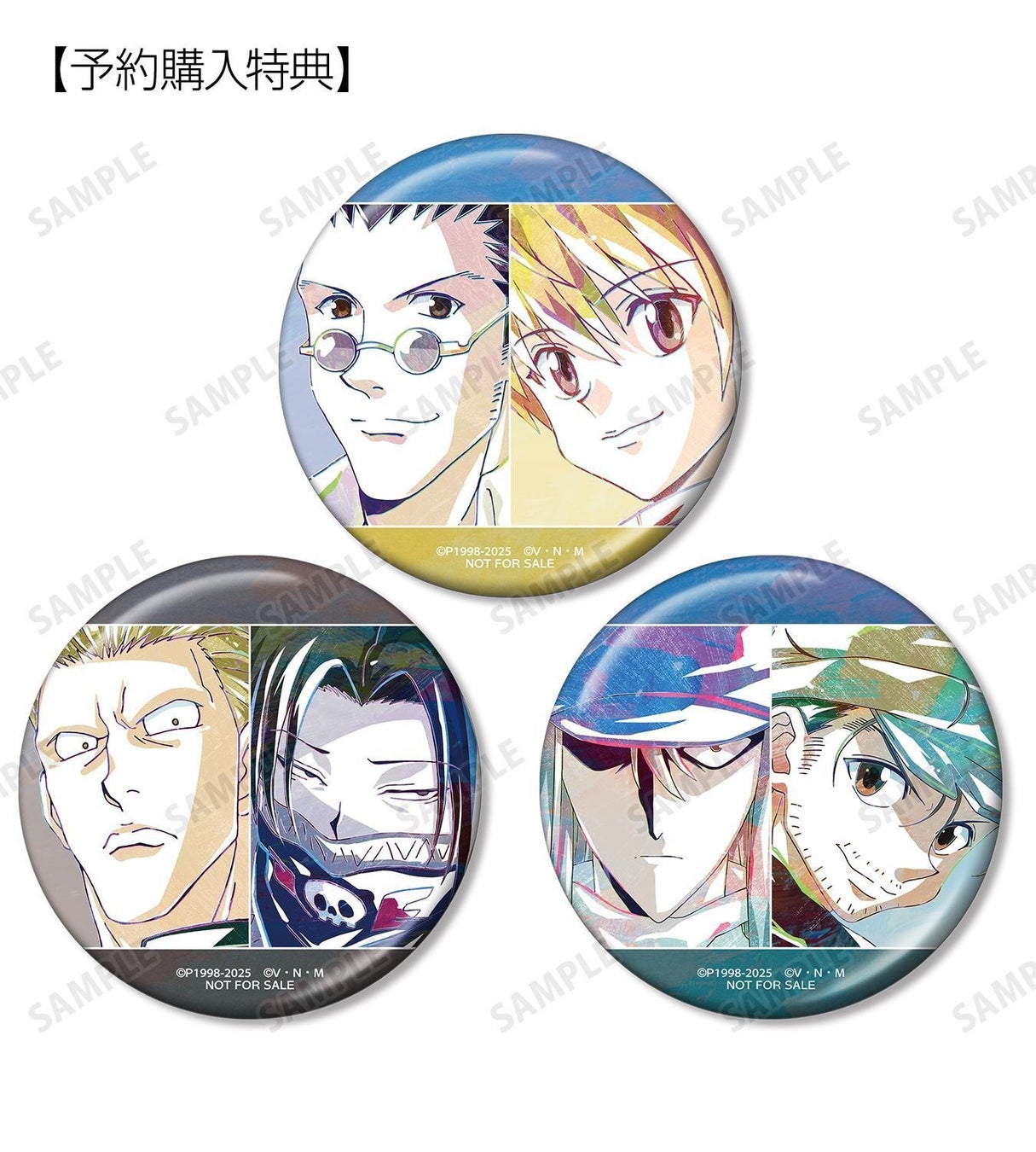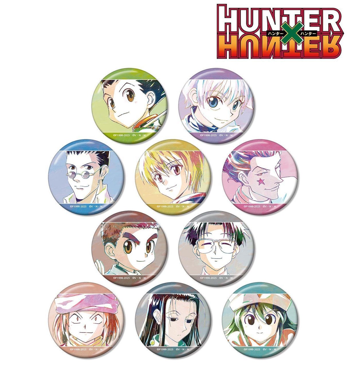 ゴン、キルア、レオリオ、クラピカ、ヒソカ、ズシ、ウイング、ポックル、イルミ、ポンズのイラストを新たなタッチで魅力的に表現し、メタリック仕様の缶バッジに仕上げました。