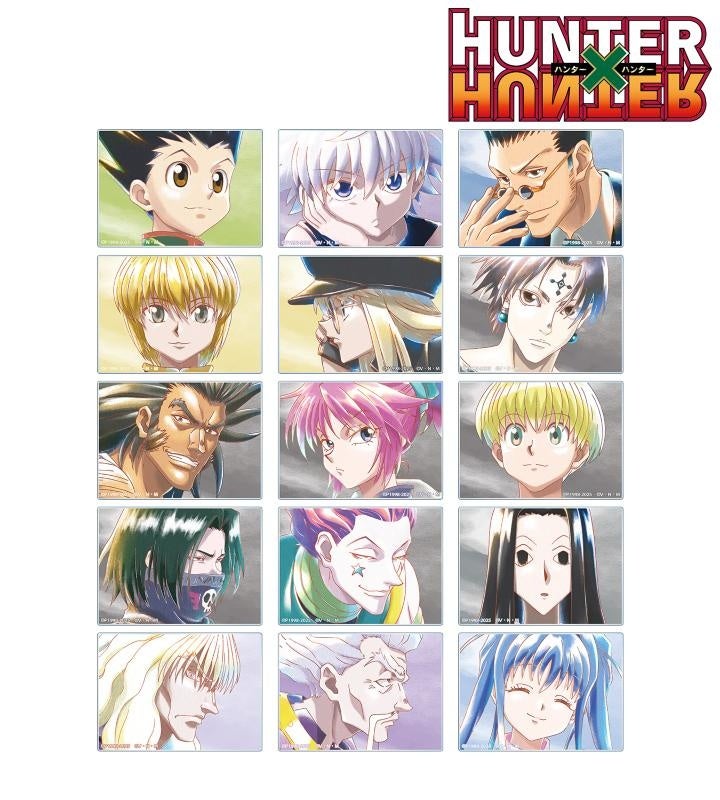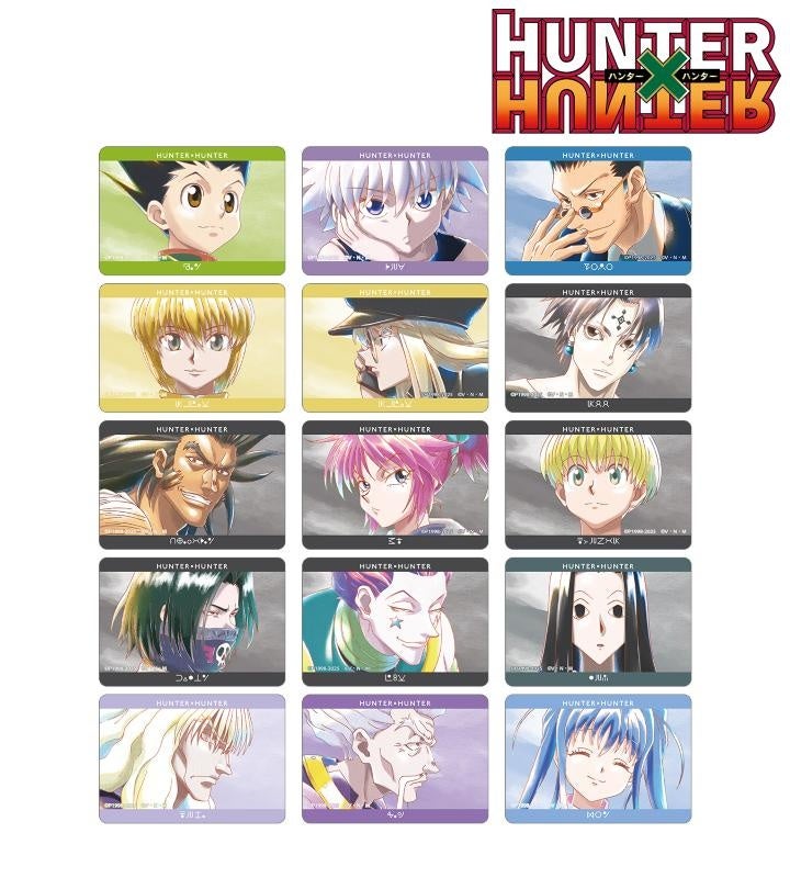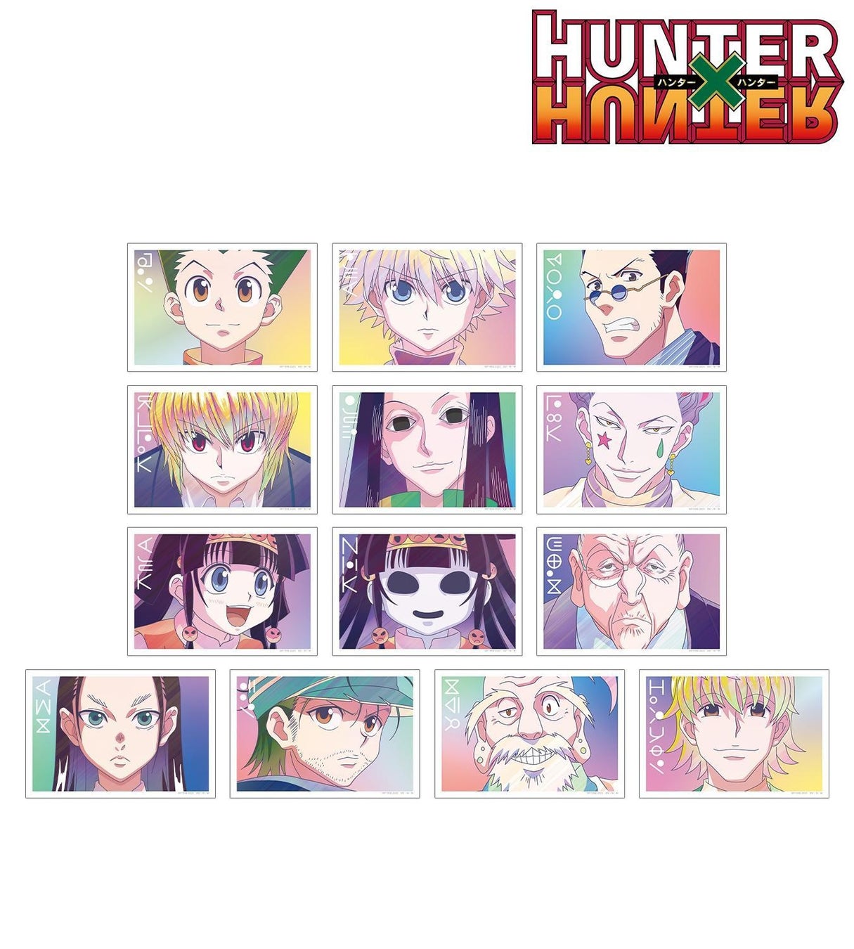 ゴン、キルア、レオリオ、クラピカ、イルミ、ヒソカ、アルカ、ナニカ、ツボネ、アマネ、ジン、ネテロ、パリストンのイラストを新たなタッチで魅力的に表現し、クリアカードに仕上げました。