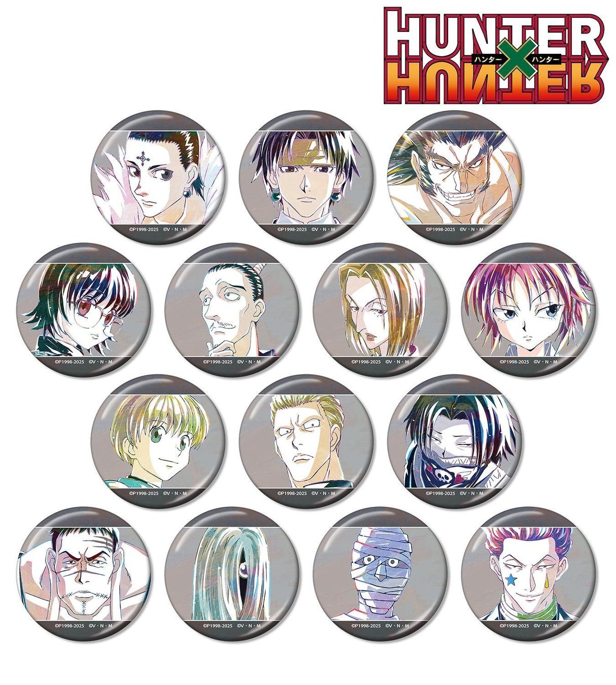 クロロ、ウボォーギン、シズク、ノブナガ、パクノダ、マチ、シャルナーク、フィンクス、フェイタン、フランクリン、コルトピ、ボノレノフ、ヒソカのイラストを新たなタッチで魅力的に表現し、メタリック仕様の缶バッジに仕上げました。