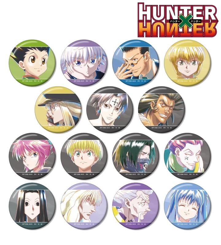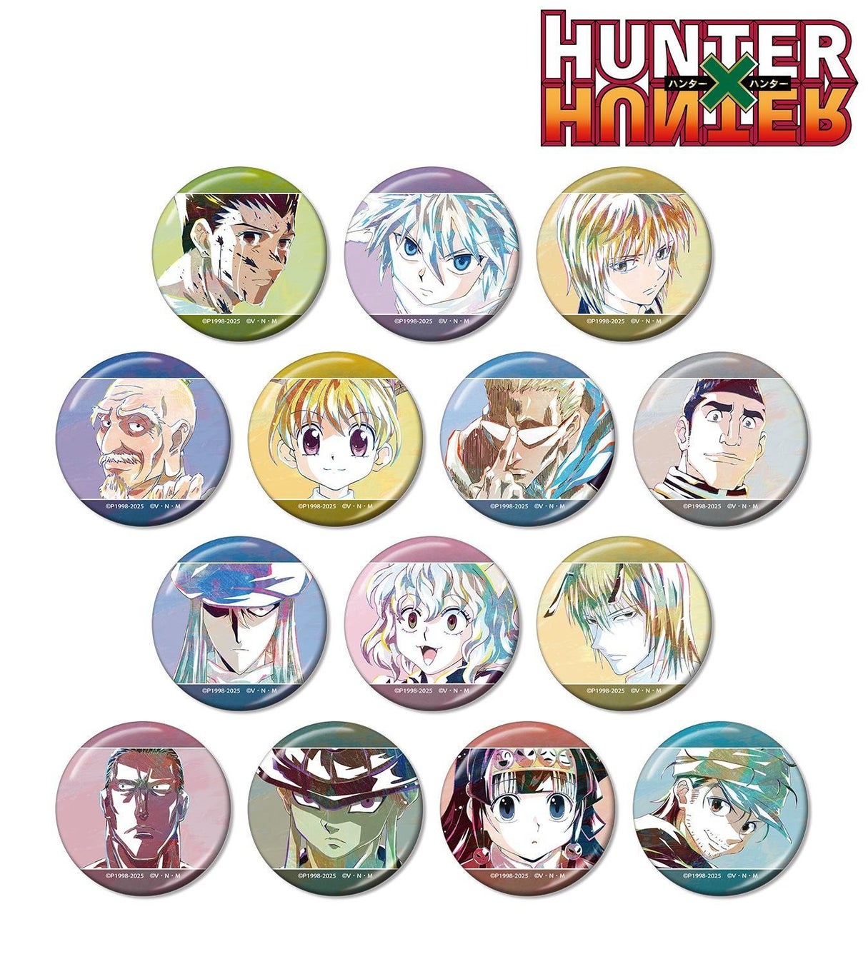 ゴン、キルア、クラピカ、ネテロ、ビスケ、ゲンスルー、ゴレイヌ、カイト、ネフェルピトー、シャウアプフ、モントゥトゥユピー、メルエム、アルカ、ジンのイラストを新たなタッチで魅力的に表現し、メタリック仕様の缶バッジに仕上げました。