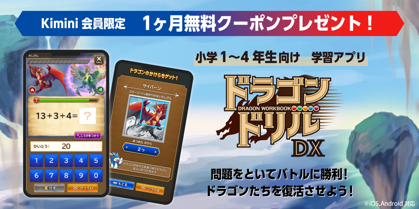 株式会社 学研ホールディングス(東京・品川/代表取締役社長:宮原博昭)のグループ会社で、オンライン英会話サービス「Kimini英会話」を提供している株式会社 Glats(東京・品川/代表取締役社長:杉原聡)は、2025年6月3日(火)より会員向けに、シリーズ累計発行部数100万部突破の大人気ドリル「ドラゴンドリル」の学習アプリ「学研ドラゴンドリル 算数/国語の学習アプリで学ぼう!」が1ヶ月無料で利用できるコラボクーポンプレゼントキャンペーンを開始いたしました。