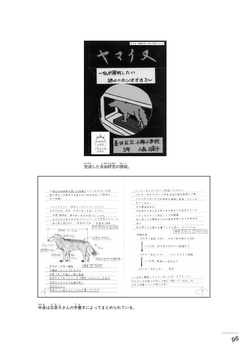 1年後、小森さんは調べたことを『ヤマイヌ~私が解明したい謎のニホンオオカミ~』として自由研究にまとめあげます。この自由研究は、第25回「図書館を使った調べる学習コンクール」(主催:公益財団法人 図書館振興財団)で文部科学大臣賞を受賞しました。