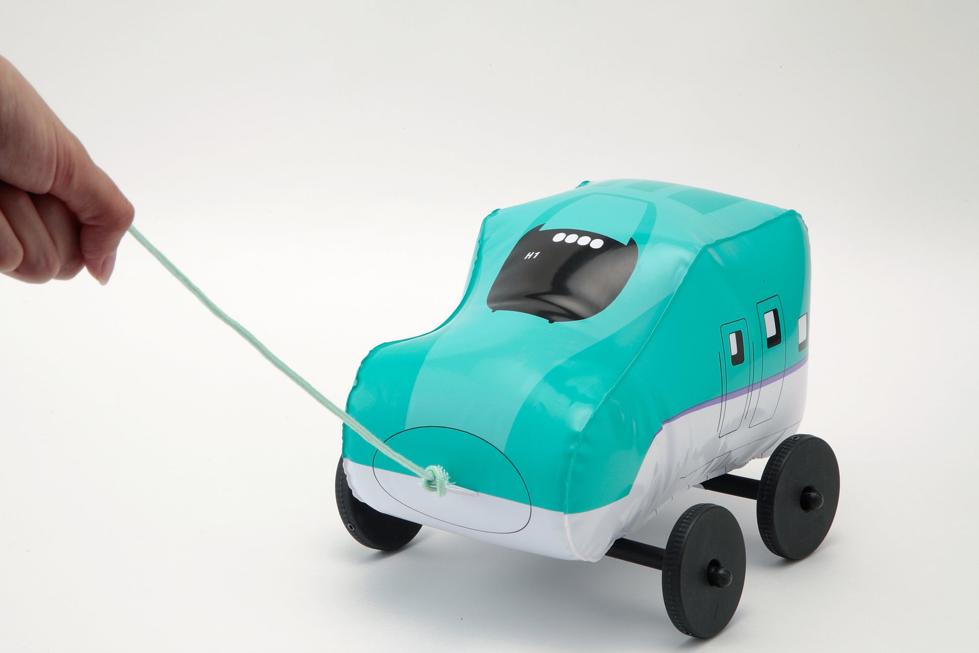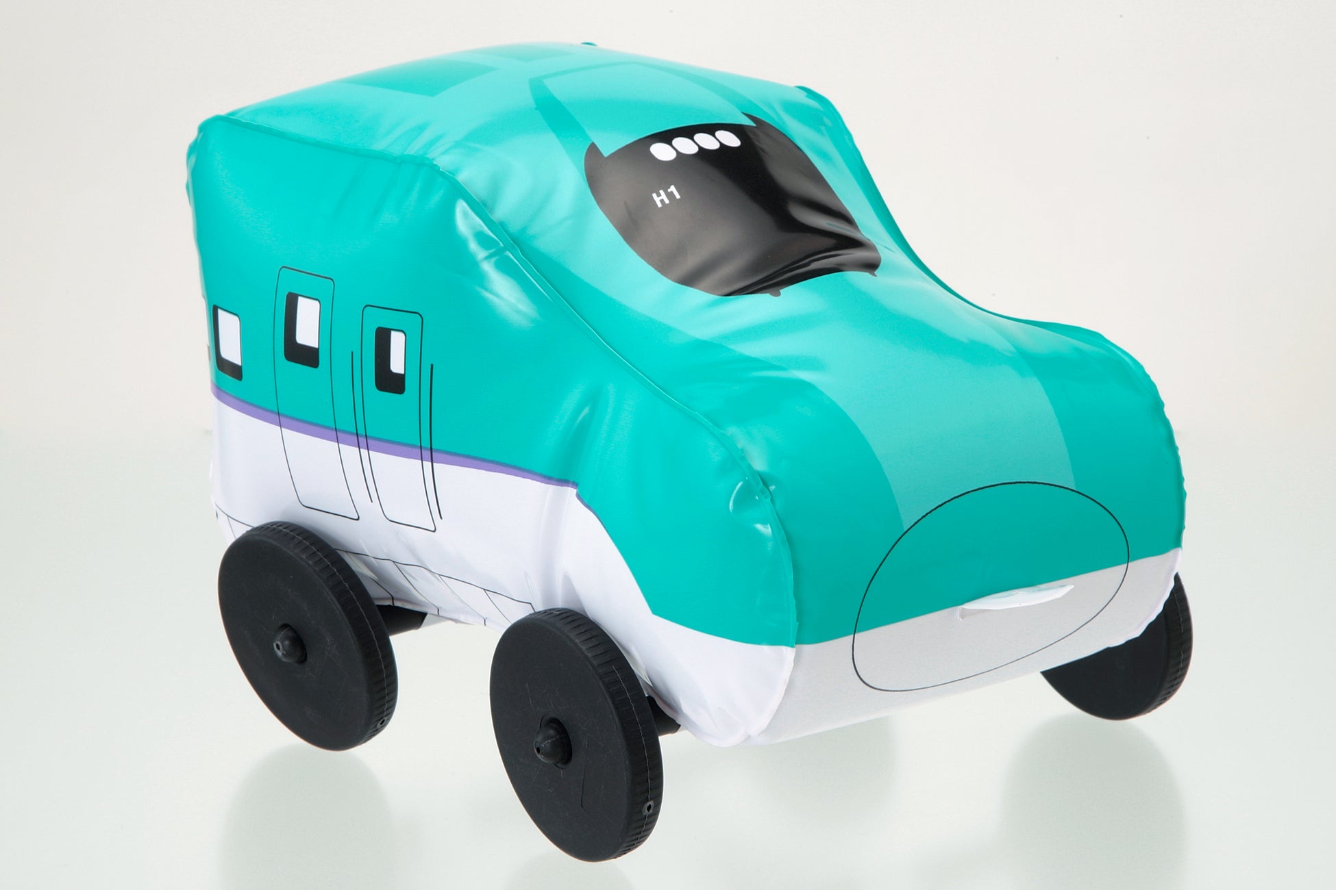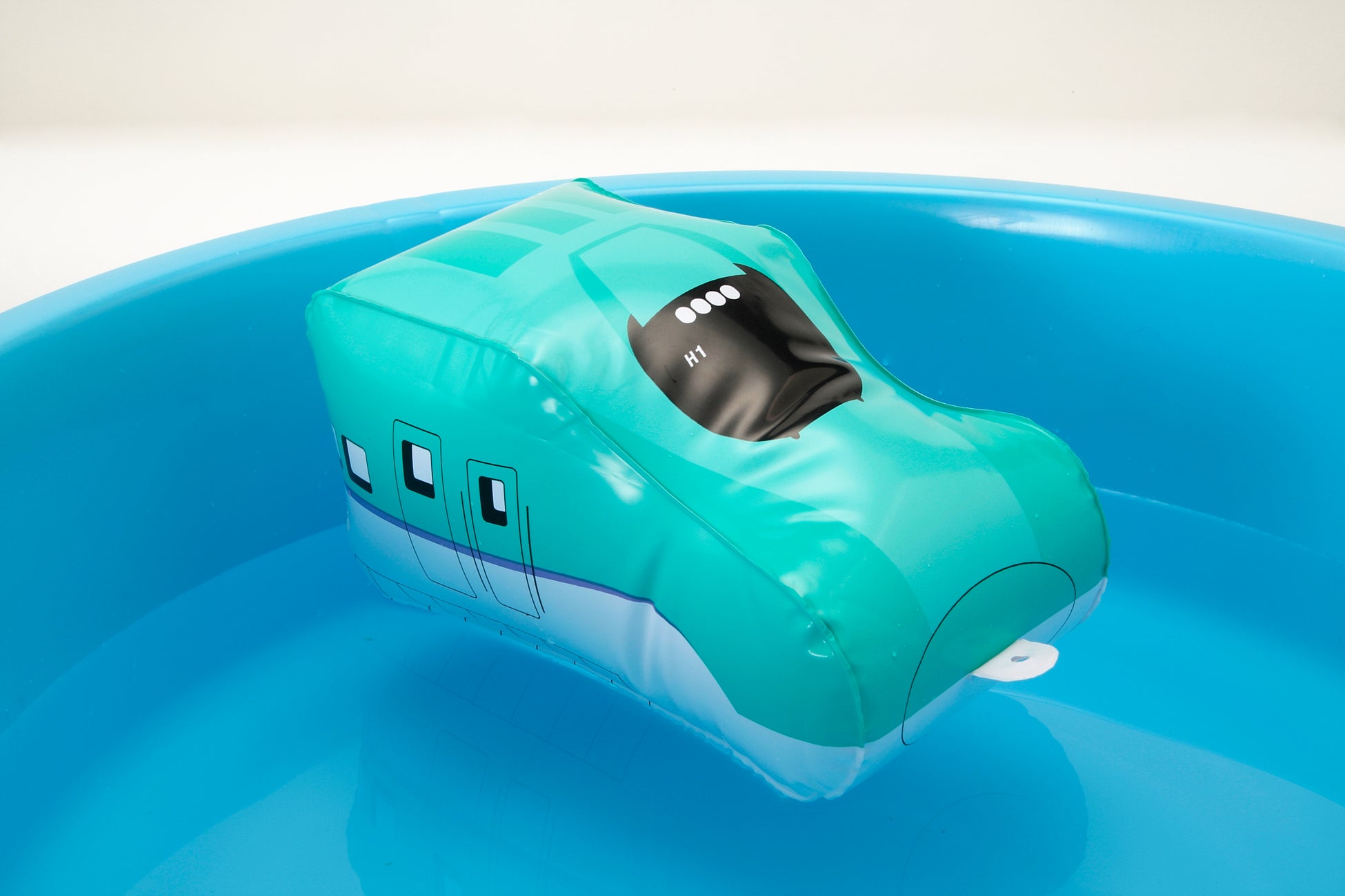 北海道新幹線H5系はやぶさにそっくりなビニールのおもちゃ。紐をつけて一緒におさんぽをしたり、お風呂に連れて行ったりできます。