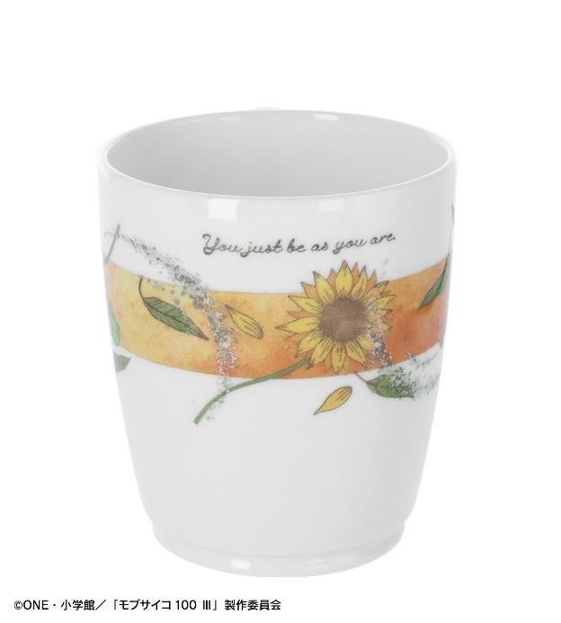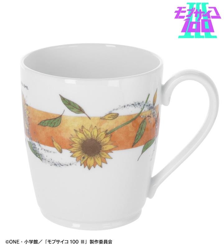 霊幻新隆をイメージした、最終話に登場する花とキャラカラーのオレンジ色が印象的でカジュアルなマグカップです。