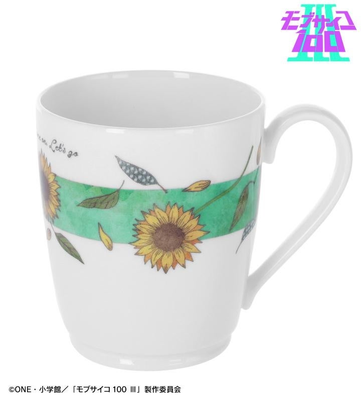 影山茂夫をイメージした、最終話に登場する花とキャラカラーの緑色が印象的でカジュアルなマグカップです。