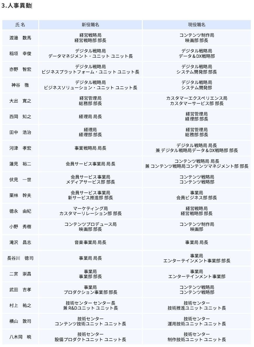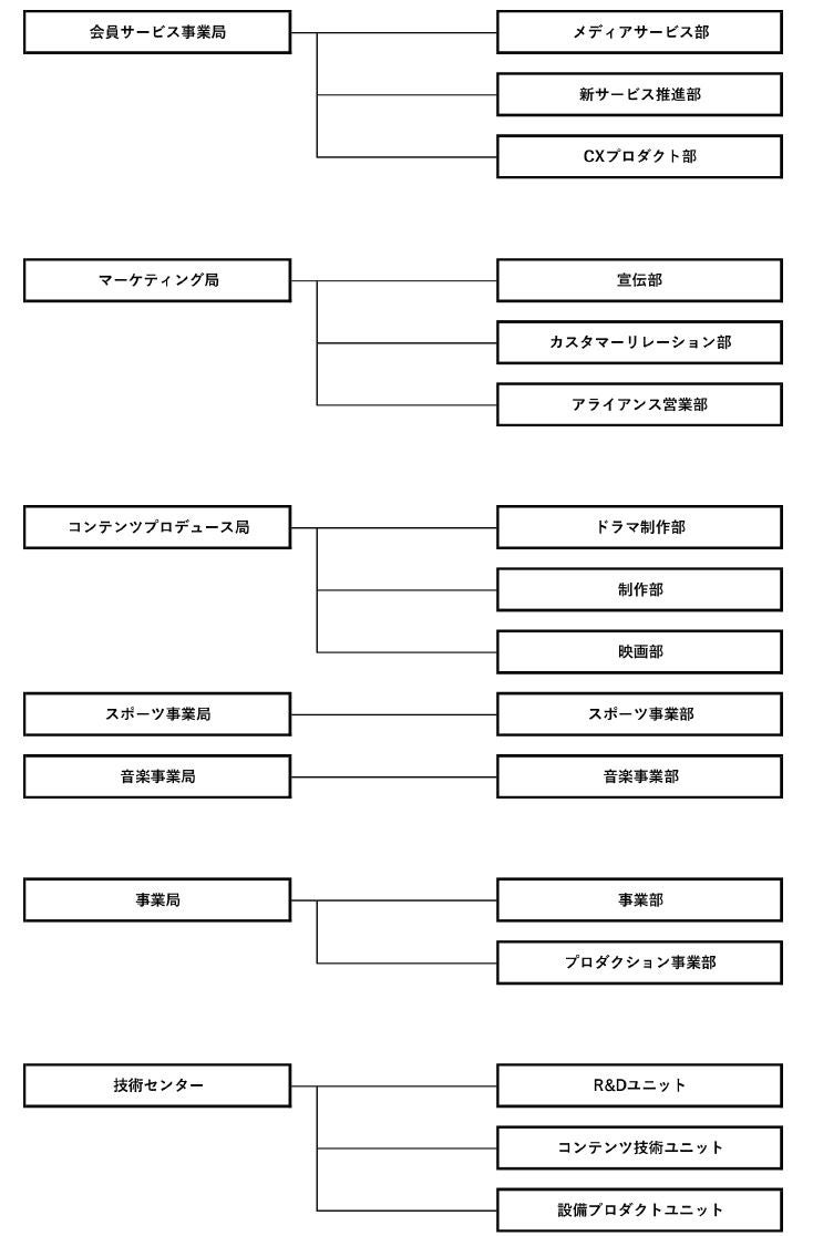 ・「コンテンツプロデュース局」は、「ドラマ制作部」「制作部」「映画部」を管轄し、会員サービスの最大化を図るコンテンツのプロデュースを図り、「事業局」とともにコンテンツ収益の向上を図る。