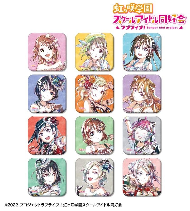 上原歩夢、中須かすみ、桜坂しずく、朝香果林、宮下 愛、近江彼方、優木せつ菜、エマ・ヴェルデ、天王寺璃奈、三船栞子、ミア・テイラー、鐘 嵐珠のイラストを新たなタッチで魅力的に表現し、スクエア缶バッジに仕上げました。