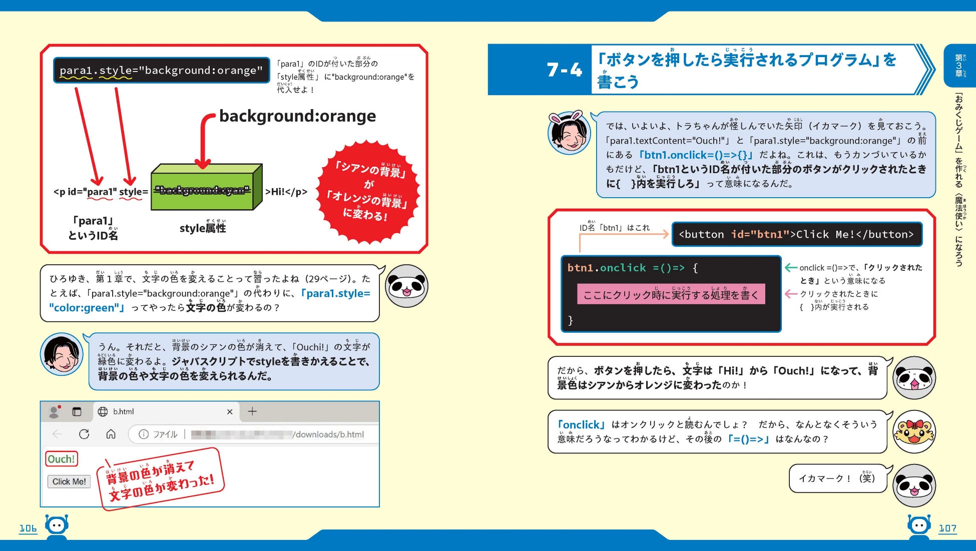すべての漢字にふりがながついていることはもちろん、マンガやイラストでひとつひとつ丁寧に解説してくれるので、楽しみながらプログラミングを勉強することができます。