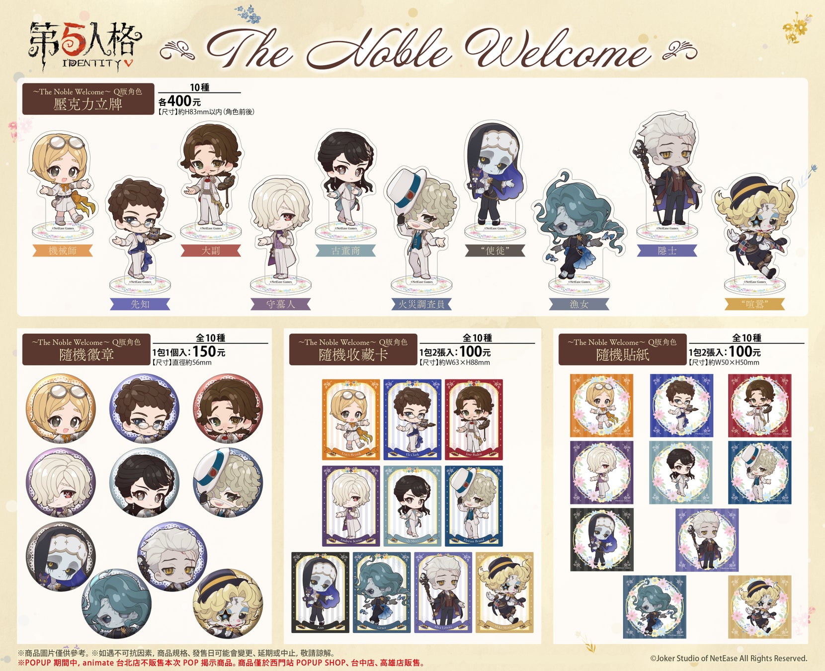 ポップアップショップでは2025年11月に初めて販売した「~The Noble Welcome~」シリーズのグッズを販売する予定です。また、イベント期間中、『Identity V 第五人格』関連商品をNT$250ご購入ごとに購入特典として「チェキ風カード(全8種)」をランダムで1枚配布します!