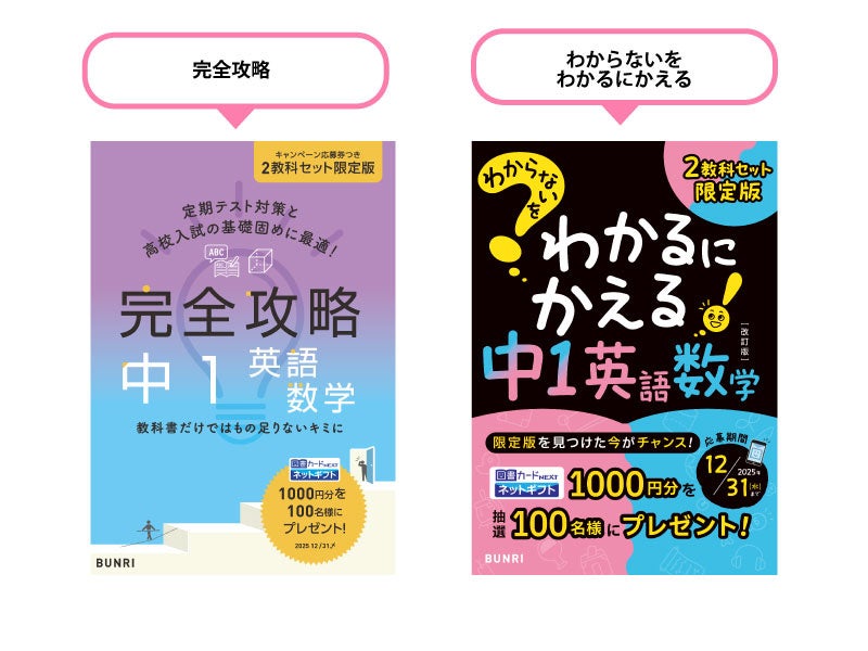 「2教科セット」は、それぞれのシリーズの中1の英語と数学の2冊がパッケージされた数量限定の商品です。