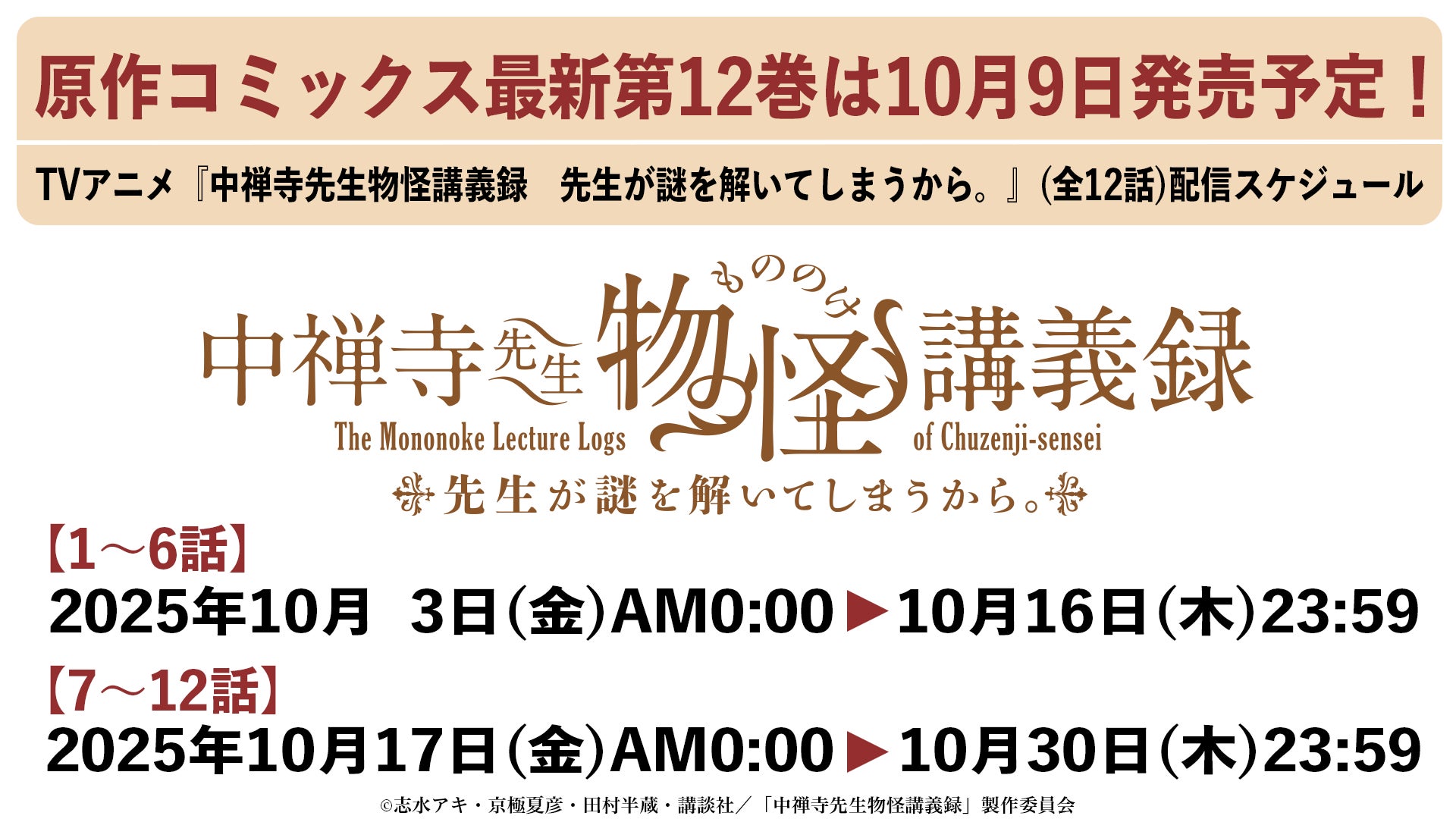 TVアニメ『中禅寺先生物怪講義録 先生が謎を解いてしまうから。』(全12話) 配信スケジュール