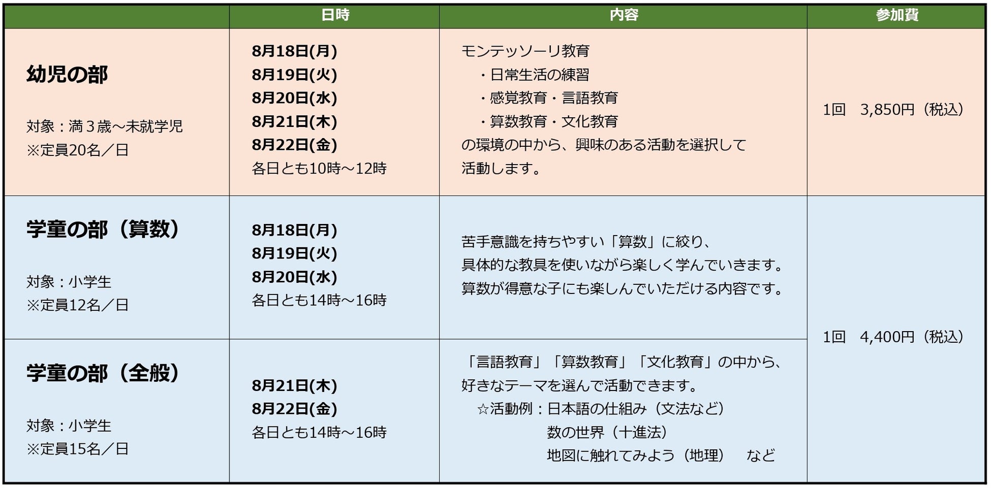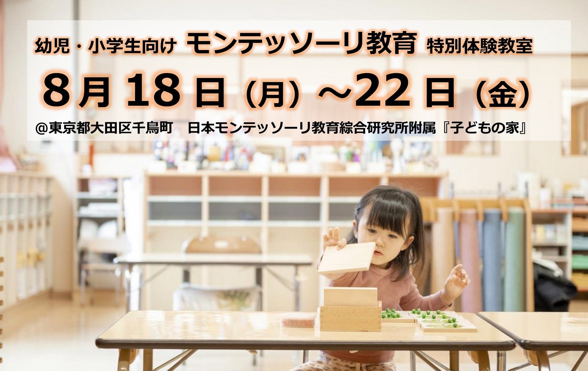 幼児と小学生向け【モンテッソーリ教育】の特別体験教室。8月18日(月)~22日(金)、毎日通っても、日を選んでもOKです。