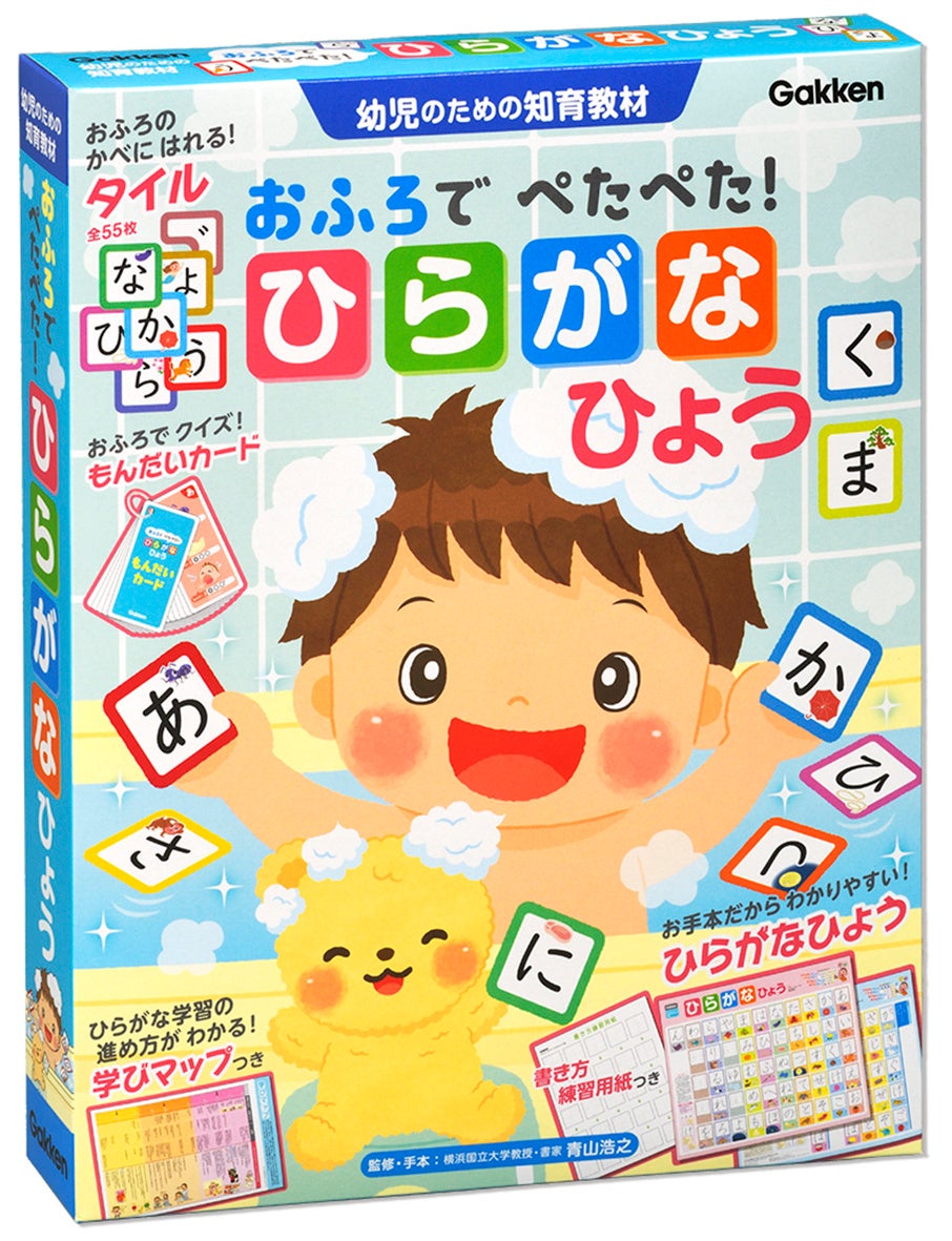 遊びながら「ひらがな学習」ができる、幼児のための知育教材『おふろでぺたぺた! ひらがなひょう』。柔らかい素材のタイルをお風呂で浮かせて、壁に貼って楽しめます。